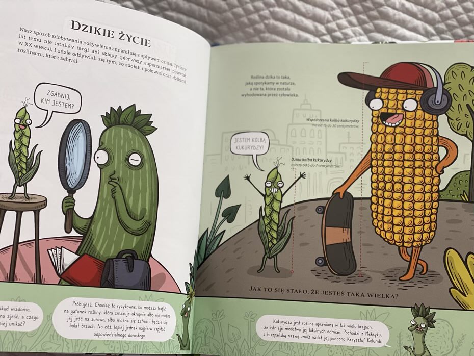 Jest tu całkiem spoko ciekawostek, które przyciągają czytelnika i powodują, że chce się odkrywać znacznie więcej. Dzieci dowiedzą się np., że rośliny były modyfikowane przez lata dzięki ingerencji ludzi, co umożliwiło stworzenie upraw, które gwarantują dobre plony. Przeczytają także o mutacjach, które pozwoliły roślinom, które wcześniej były trujące, stać się roślinami jadalnymi. Odkryją pochodzenie wielu produktów spożywczych, które codziennie znajdują się na naszym stole i które jednak nie są rodzime. Nauczą się także o różnorodności, geografii, ludzkiej interwencji i kulturach.