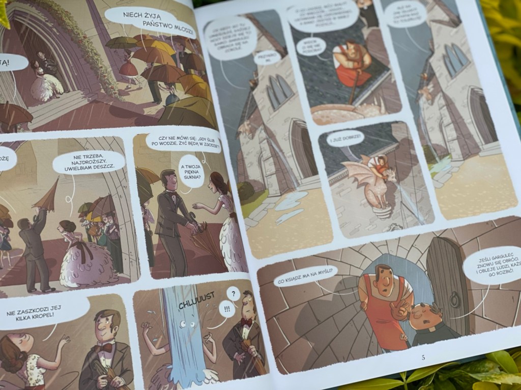 „Enola i niezwykłe zwierzęta” to komiks, który jest przykładem niesienia bezinteresownej pomocy. Pokusiłam się na tytuł ze względu na historię o gargulcu, o którym przeczytałam w opisie na stronie wydawnictwa Egmont. Pamiętam jak kiedyś Adaś, po raz pierwszy zapytał o posąg, mieszczący się na dachu jednego z kościołów. Był ciekawy, co te potwory robią i jakie kiedyś było ich zadanie. Nigdy wcześniej nie spotkałam się z książką, której historia dotyczyłaby gargulca. Muszę przyznać, że obie części czyta się szybko i są polecane dla młodych dzieci. Tekstu jest mało, ale dzięki kolorowym kadrom, całość ma spójność.