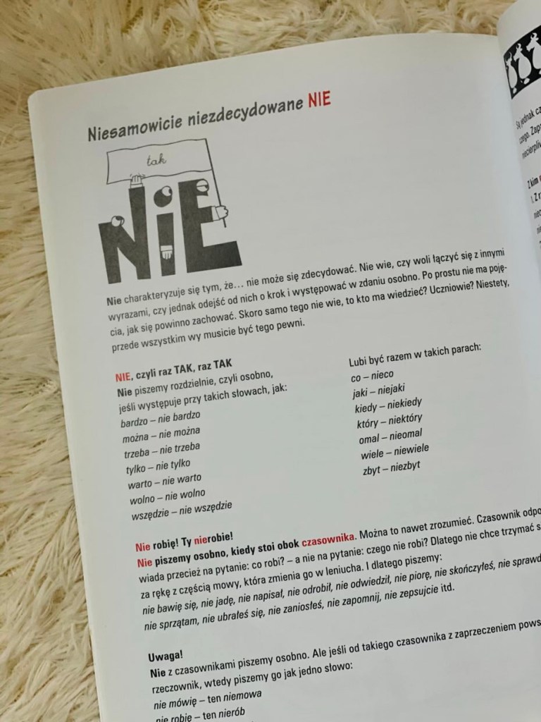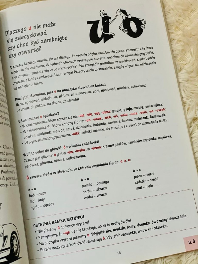 Na początku młody czytelnik pozna reguły, kiedy stawić kropkę, a kiedy przecinek. Następnie pozna zasady wielkich liter, kiedy piszemy u, ó, h, ch, ż, rz, ę, ą, głosiki dźwięczne oraz bezdźwięczne. Przejdzie do kolejnych działów, by dowiedzieć się, kiedy pisać ć, ci, ś, si, i, ii, ji, u, ł. Natomiast ostanie sekcje wytłumaczą poprawną pisownię z nie i niektórych wyrażeń przyimkowych.
