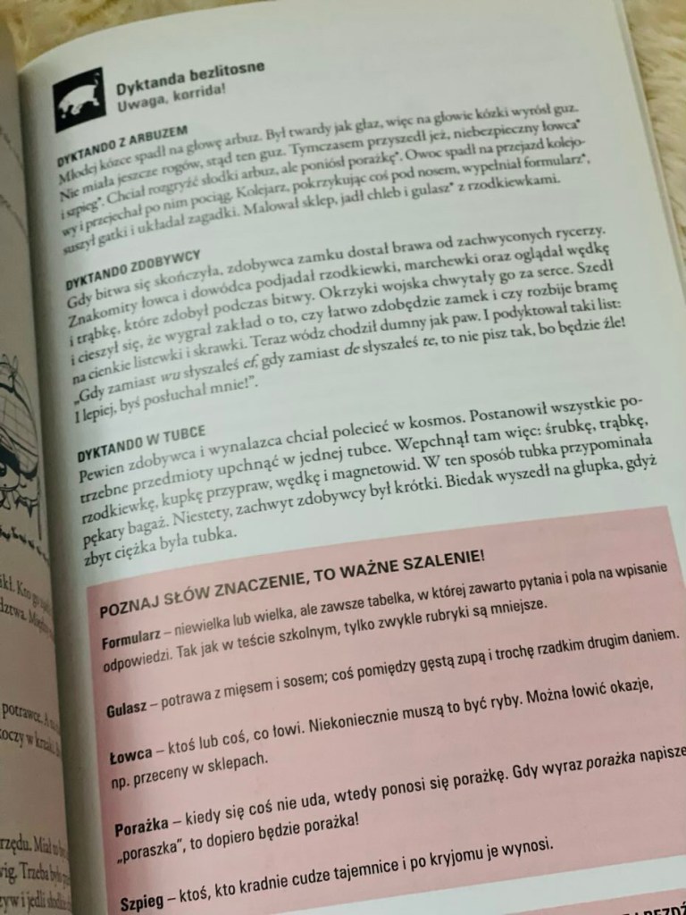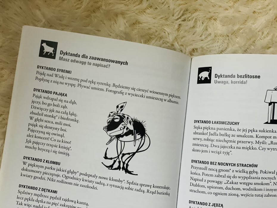 13 rozdziałów omawia zasady ortograficzne w sposób prosty i łatwo przyswajalny. Jak już wspomniałam, na dziecko czekają dyktanda o różnym stopniu trudności i każde ma ikonkę byka. Rozpoczynając od najłatwiejszego, widzimy małego byczka, następnie jest dyktando dla zaawansowanych z postacią dorosłego byka, a by sprawdzić poziom dla geniuszy, widzimy wściekłego samca. Trudne lub mniej znane słowa, które pojawiły się w tekstach z dyktand, zostały wytłumaczone przez autora i umieszczone na końcu każdego rozdziału.
