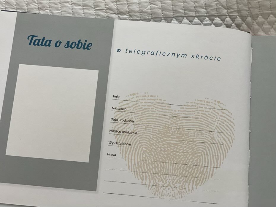 Jak widzicie, „Album taty” oferuje długie godziny spisywania wspomnień i marzeń. Uważam, że taki pamiętnik to świetna okazja, by jeszcze lepiej się zrozumieć i poznać. „Album taty” może być także pięknym podarunkiem w Dniu Ojca oraz znakomitym pretekstem do zaangażowania go, by wspólnie ustalić i śledzić jego historię wraz z zapiskami.