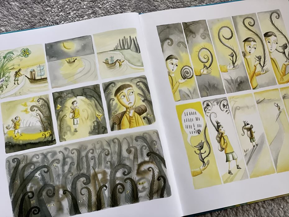 Jedyne słowa użyte w tej powieści graficznej to te, które wskazują miejsca na mapach podróży małego bohatera. Fantastyczne i sugestywne krainy, które z wielką inwencją i różnorodnością wyrażają wszelkie niuanse emocji, od radości po wstyd, od zdumienia po smutek oraz miłość.