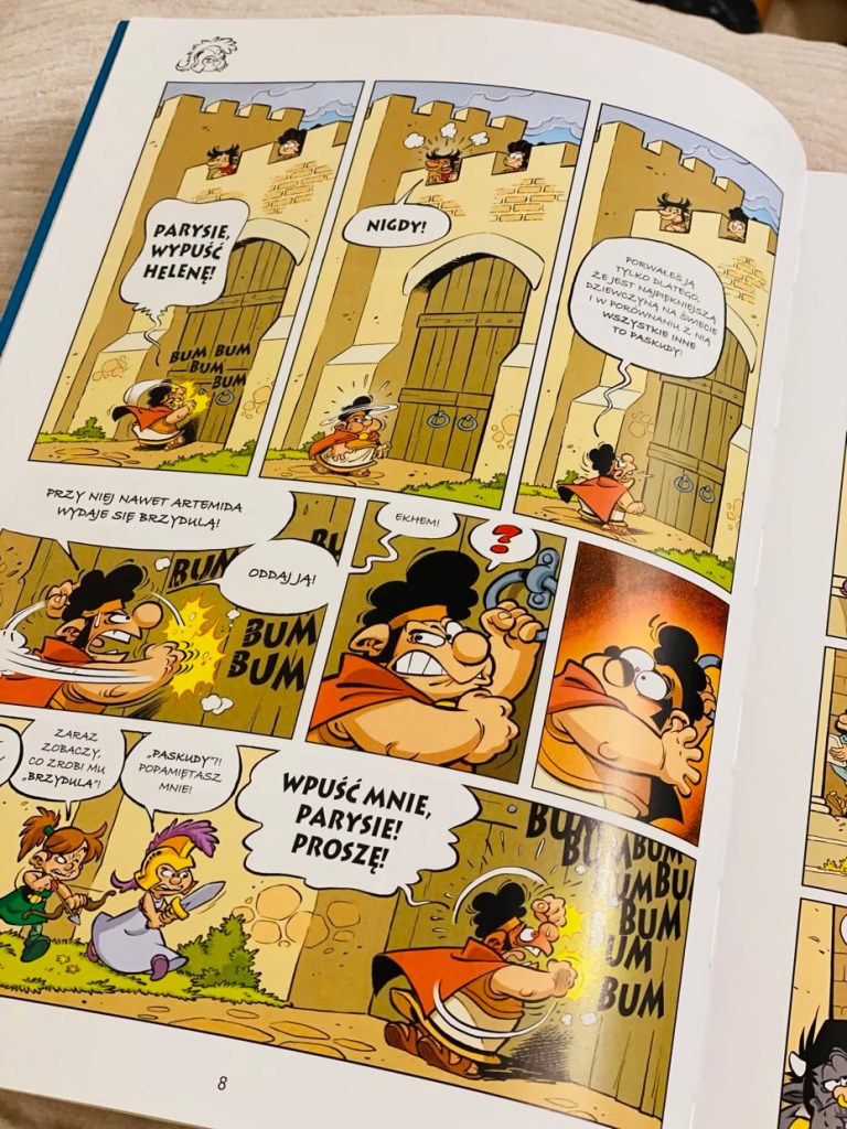 Ten komiks w dużej mierze pokazuje młodym czytelnikom dalsze losy Tauruska i jego pomysły na przedstawienie Zeusowi, żeby stać się jednym z bogów. Będzie też wątek uprowadzenia Heleny przez Parysa i próba odbicia pięknej szwagierki przez Agamemnona, dzięki drewnianemu konikowi trojańskiemu. Młodzi czytelnicy zobaczą Odyseusza, który postanawia wypłynąć w morze, ale robi wszystko, żeby tego jednak nie zrobić. Dzieci przyglądną się zakatarzonemu Posejdonowi oraz grze w kółko/krzyżyk z Zeusem.