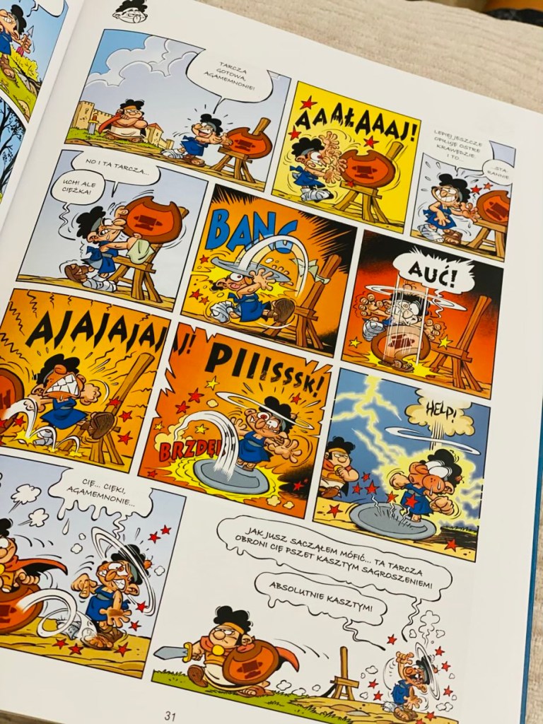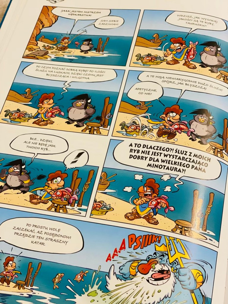 „Komedia Posejdona. Mali Bogowie. Tom 4” to komiks o mitologi greckiej na wesoło. Jak w poprzednich częściach, kadry są bardzo kolorowe, bohaterowie sympatyczni, a dialogi śmieszne. Cała seria w naszym domu bardzo dobrze się przyjęła i z niecierpliwością wyczekujemy kolejnych przygód naszych ulubieńców. Polecam.
