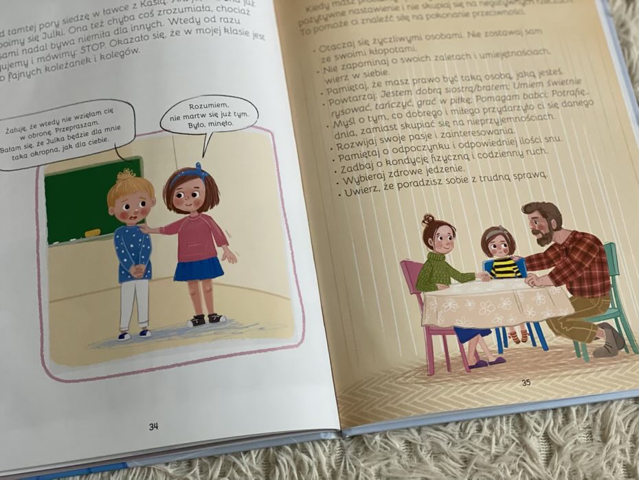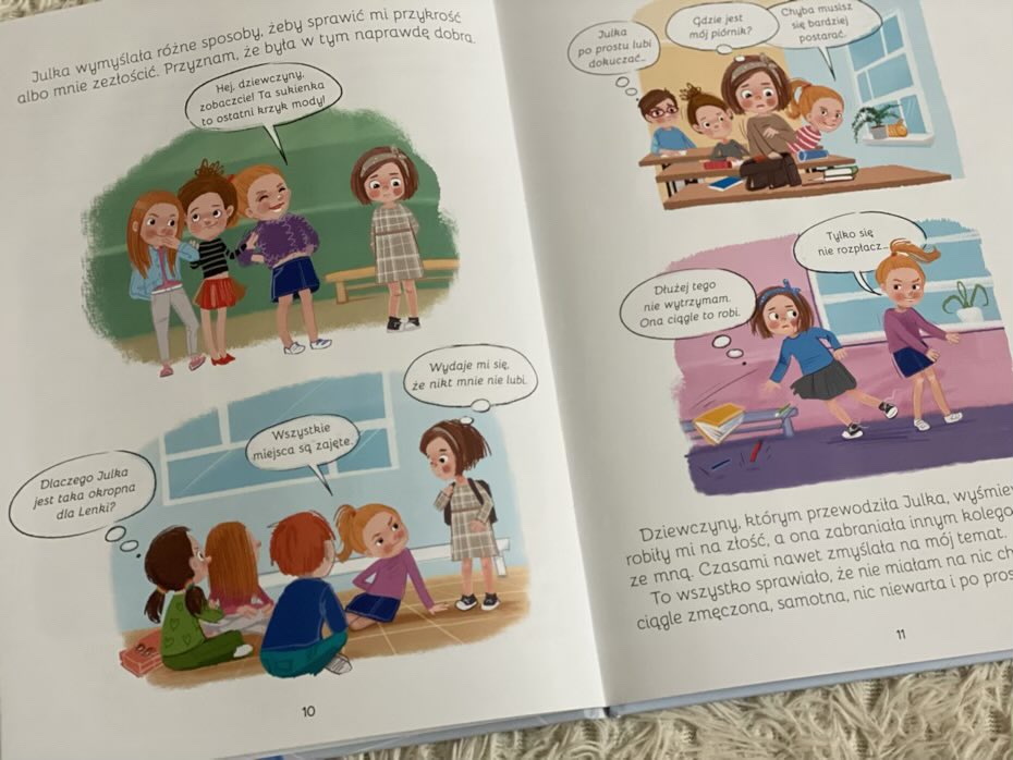 „Wielkie problemy małych ludzi. Nie daj się gnębić” to tytuł, który ukazał się dzięki nakładowi Wydawnictwa Jedność. Ma na celu pomóc dzieciom zrozumieć jakie skutki i konsekwencje ma nękanie rówieśnicze. Dzięki przytoczonej historii, młody czytelnik jest w stanie wyobrazić sobie powagę sytuacji i wyczulić się na nadchodzące zagrożenie. Końcowe strony podpowiadają jak przeciwstawić się dręczycielom, a rodzice znajdą ważne porady jak wesprzeć swoją pociechę. Gorąco polecam.