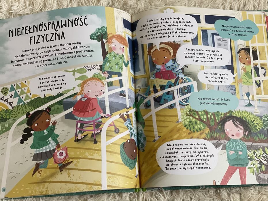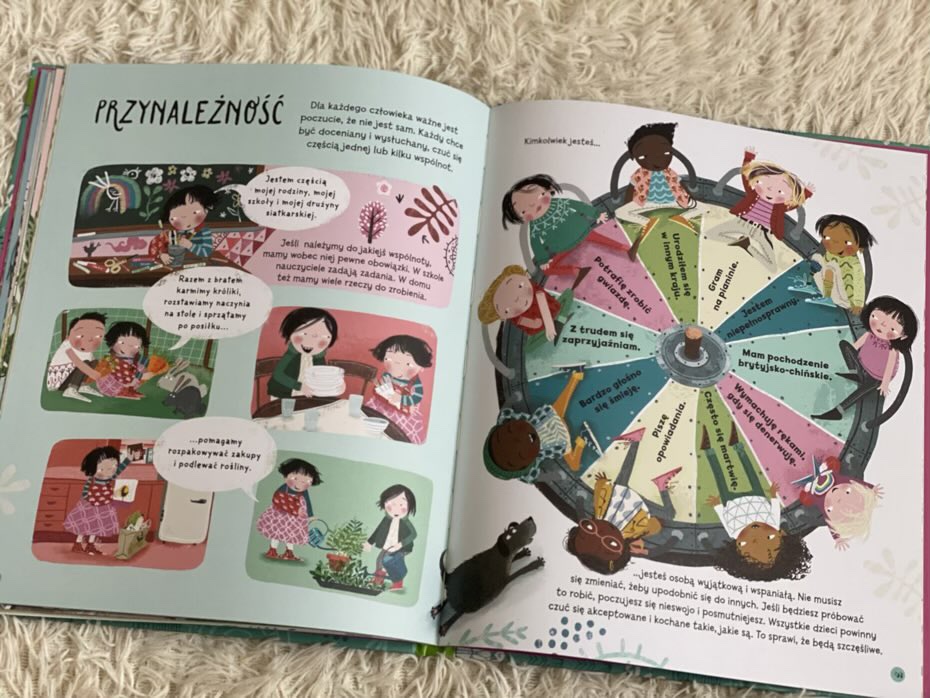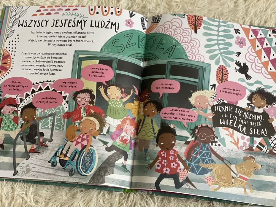 Tracey Turner w tej niezwykłej publikacji ujęła bardzo ważne tematy, które dotyczą nie tylko różnych płci, modeli rodzin, kultur czy wierzeń, ale także przestawiła aspekty dotyczące niepełnosprawności intelektualnej i fizycznej, trudnościach w nauce i dysfunkcjach z tym związanych. Wszystkie te zagadnienia uświadamiają czytelnikiem, że świat jest wspaniale urozmaicony właśnie dzięki temu, że pięknie się różnimy, choć mamy ze sobą wiele wspólnego – odczuwamy podobne emocje i często lubimy te same rzeczy.