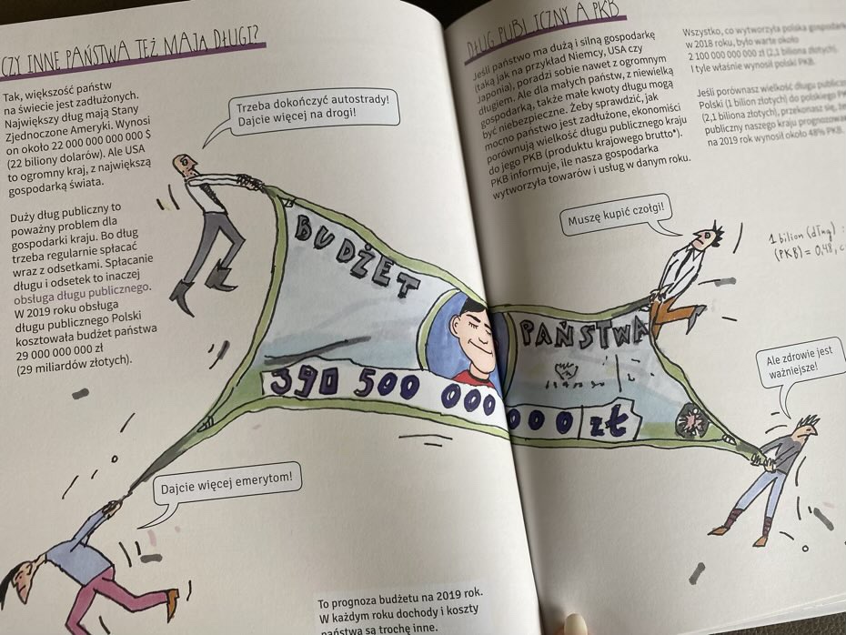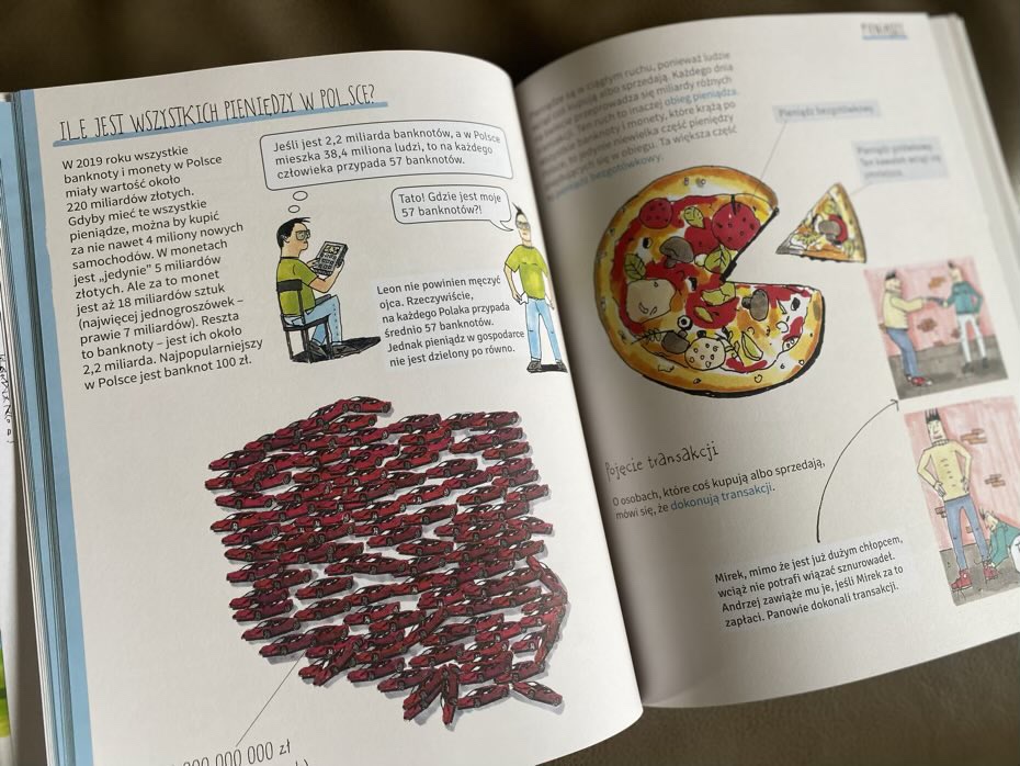 Dzięki tej książce młody czytelnik zrozumie zagadnienia finansowe, dowie się czym jest pieniądz, skąd ludzie biorą rzeczy, których potrzebują, jak działają banki, czym są:jest gospodarka, kredyty, budżety domowe i państwa.