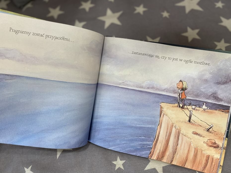 Młody czytelnik zanurza się w światy dwójki małych dzieci, które pomimo życia po przeciwnych stronach świata mają wspólne pragnienie – dzielić swoje życie jako przyjaciele. To ogromna trudność, kiedy jest się tak daleko od drugiej osoby.