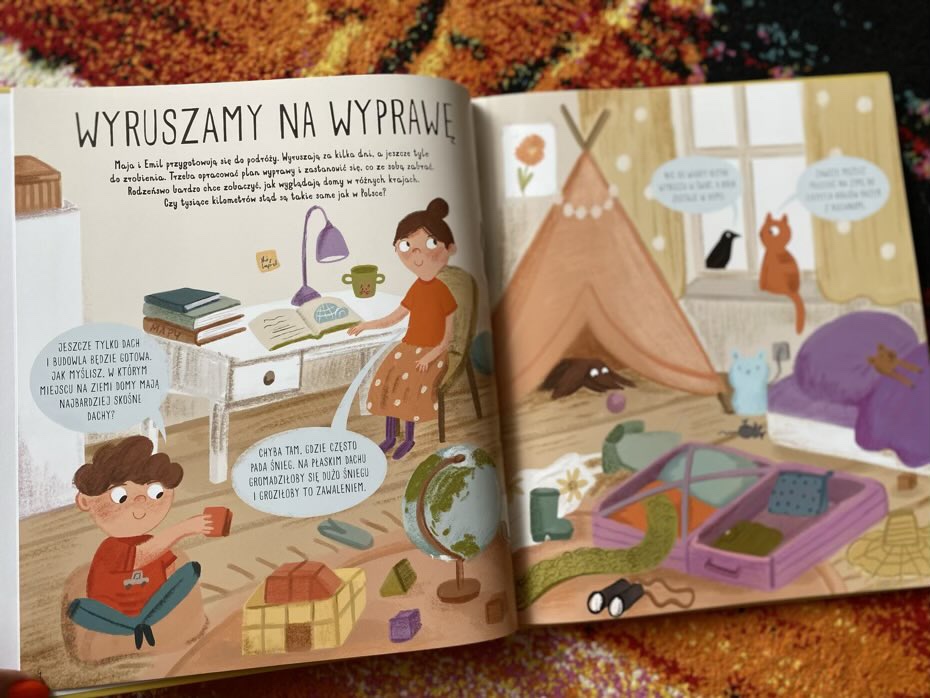 W tej kolorowej książeczce znajdziemy 28 różnorodnych domów z 6 kontynentów niebieskiej planety. Przewodnikami po lekturze są Maja i jej brat Emil. Wspólnie przygotowują się do długiej podróży, pakując potrzebne rzeczy. Rodzeństwo chce zobaczyć, jak wyglądają domy w różnych krajach i czy są takie same jak w Polsce.