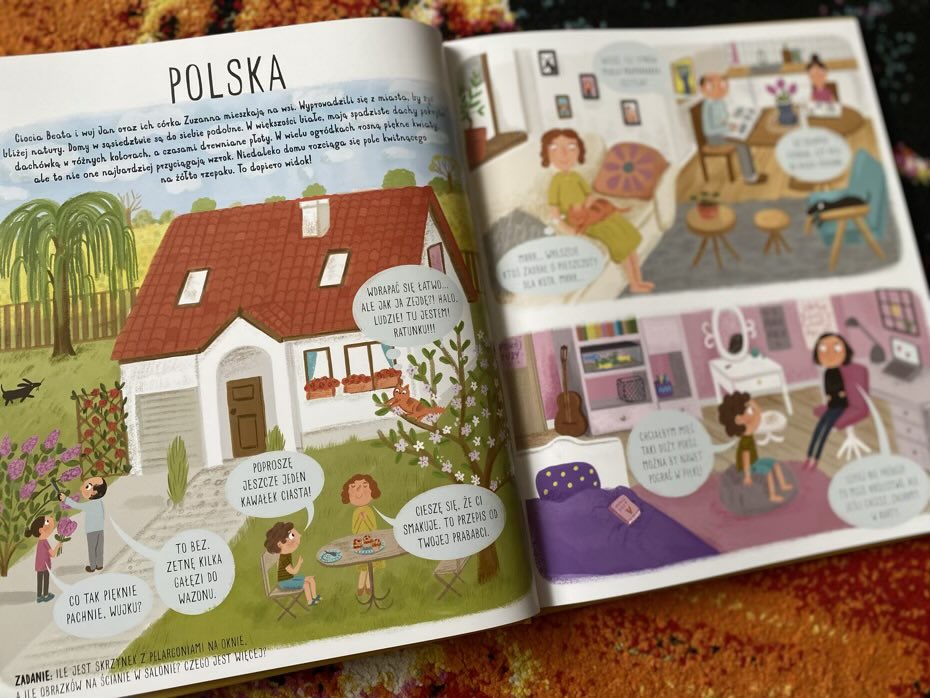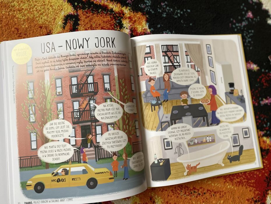 Ilustracje są kolorowe i bardzo detaliczne. Język jest prosty i przystępny dla małych dzieci. Dodatkowo w każdym kraju na młodego odbiorcę czeka zadnie, które wymaga zrozumienia tekstu lub spostrzegawczości. Dodatkowo na wklejkach znajdują się miniaturki domów i zadanie od kotka, towarzysza Mai i Emila.