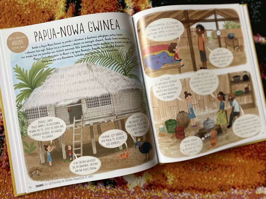 Nasi bohaterowie swoją wycieczkę rozpoczynają w Polsce, a kończą w upalnej Kenii. Każdy kraj, który został opisany przez autorkę, ma podwójną rozkładówkę. Po prawej stronie widzimy słowo dom w języku danego miasta. Jest też krótki wstęp o danym regionie, a następnie dialogi miedzy Mają, Emilem i gospodarzami. Młodzi czytelnicy dowiadują się ciekawych faktów, np. co jedzą mieszkańcy, jak mieszkają czy dlaczego ich domy są tak zbudowane.
