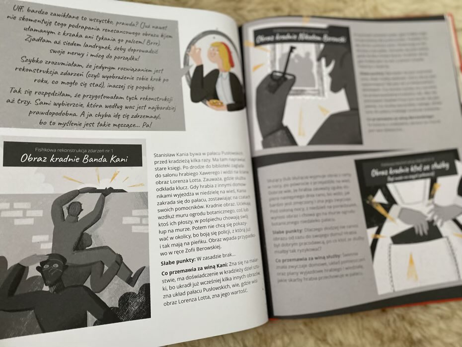 Książka napisana jest w pierwszej osobie, w formie monologu skierowanego do czytelnika. Autorka bardzo ciekawie zaznajamia czytelników z zagadkami historii sztuki, które są ściśle powiązane z Polską. Mapka na wklejce pokazuje im także regiony kraju, nad którymi będzie pracowała Fishka i starała się rozwiązać tamtejsze śledztwa.