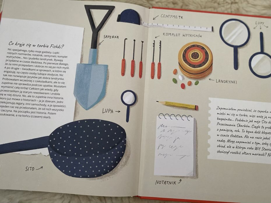 Młodzi czytelnicy poznają detektywkę Fishkę, młodą dziewczynę w czerwonym berecie z torbą na ramieniu. W jej torbie skryte są lupki różnych rozmiarów, notatnik, centymetr, komplet wytrychów i pudełko landrynek. Cukierki umilają jej śledztwo i do tego smakują wyśmienicie, lepiej od czekolady. Fishka, jako prawdziwa tropicielka, ma także saperkę i “Sito” do Przesiewania Skarbów, które wozi na bagażniku swojego zdezelowanego roweru.