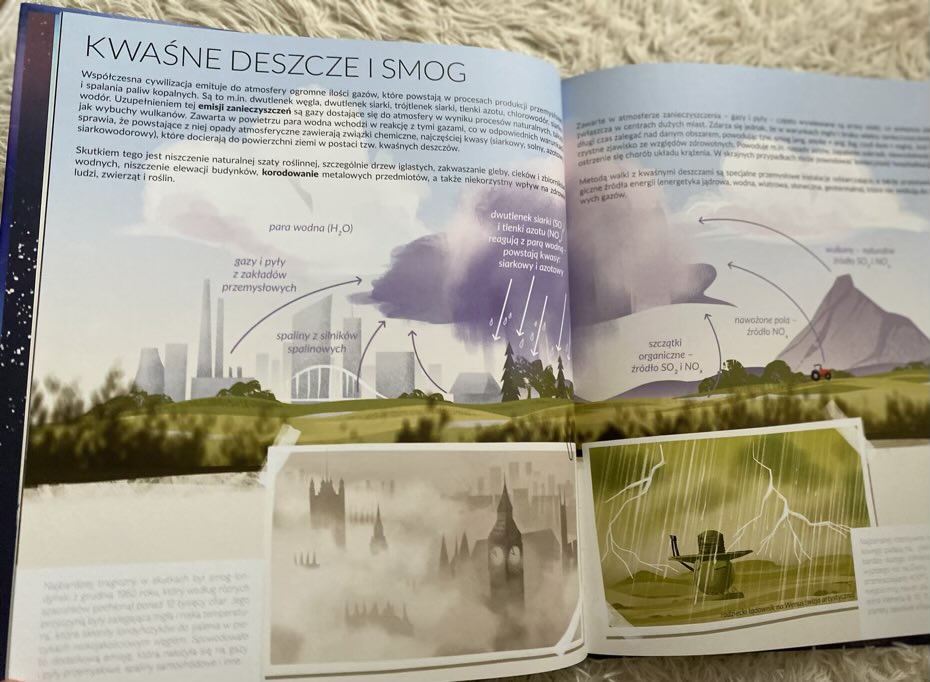 Przemysław Rudź stworzył ciekawy tytuł dla dzieci i fachowo wyjaśnił im zjawiska atmosferyczne, jakie panują na kuli ziemskiej i w przestrzeni kosmicznej. Ilustracje Magdaleny Firydus dobrze współgrają z tekstem, są wykonane starannie i precyzyjnie. Publikacja zamknięta jest w twardej oprawie, a okładka ma holograficzny tytuł, co według mnie świetnie wygląda.
