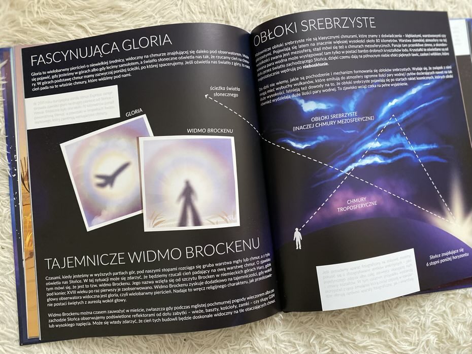 „Spójrz w niebo” to lektura dla dzieci z rzetelną wiedzą i pięknymi rysunkami. Jeśli szukacie pozycji książkowej o tematyce zachowań atmosferycznych, lepiej trafić nie mogliście. Co prawda 49,99zł to spory wydatek w księgarni stacjonarnej, jednak warto zerknąć w internet i zaoszczędzić kilka złotówek. Tytuł polecam osobom powyżej 7. roku życia.