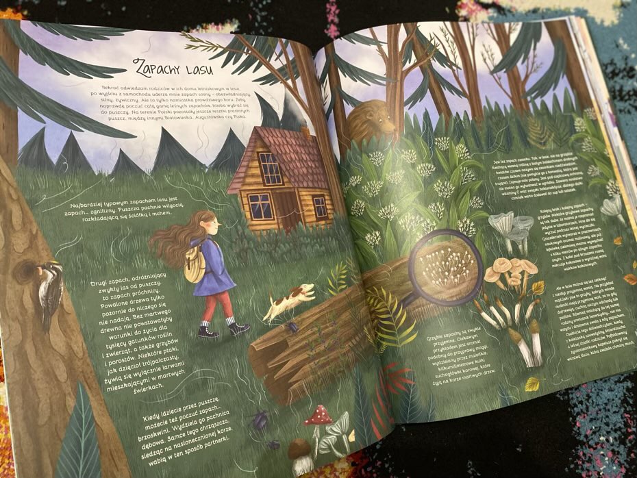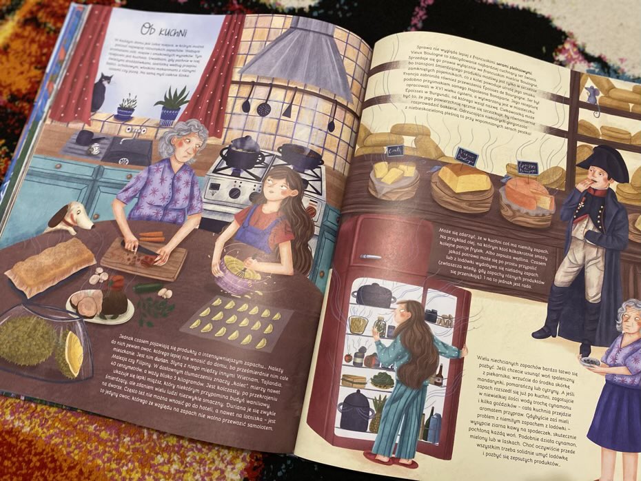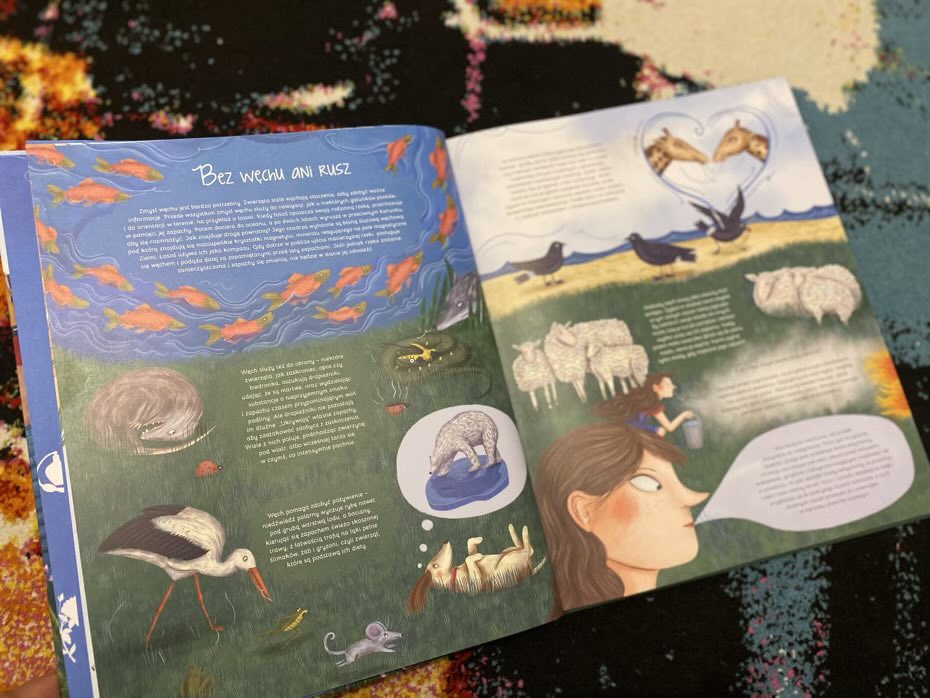 Na stronach będziemy mogli zatem przeczytać, jak w świecie zwierząt ich zmysł węchu służy im do obrony przed drapieżnikami, zdobywaniu pożywienia, wyborze partnera czy rozpoznawaniu swojego potomstwa. Następnie przejdziemy do eksperymentów, w których młodzi czytelnicy mogą pobawić się w odgadywanie różnego rodzaju aromatów.