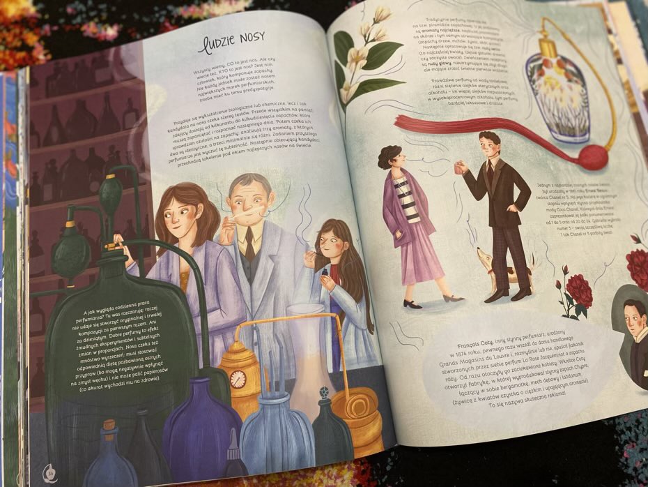 W tej dużego rozmiaru publikacji wyczytamy sporo ciekawostek o zapachach różnego kalibru. Jednak nim autorka podzieli się z dziećmi wyszukanymi pojęciami i tematami, na wstępie wyjaśnia czym jest zapach i jak go czujemy.