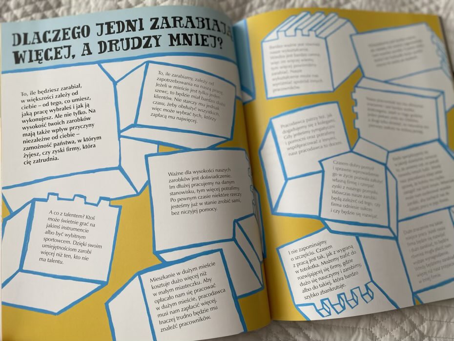 Publikacja oferuje młodym czytelnikom wyjaśnienia z zakresu marketingu i pomaga zagłębić się w gałęzie ekonomii. Dzieci z publikacji dowiedzą się czym jest pieniądz i jakie były jego początki. Do czego nam służy i czy możemy zastąpić go czyś innym. Jak rozróżnić fałszywy pieniądz od prawdziwego i jakie konsekwencje czekają na podrabiających waluty. Następnie czytelnicy wyczytają, że praca, którą ludzie wykonują, zaspokaja ich potrzeby. Książka tłumaczy kto może pracować, a kto nie.