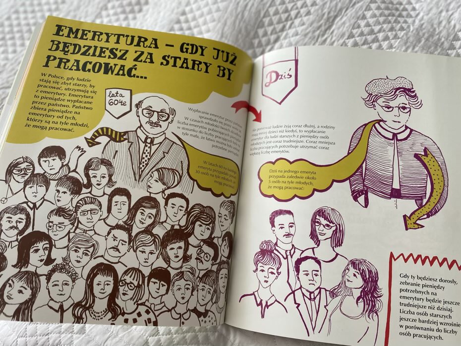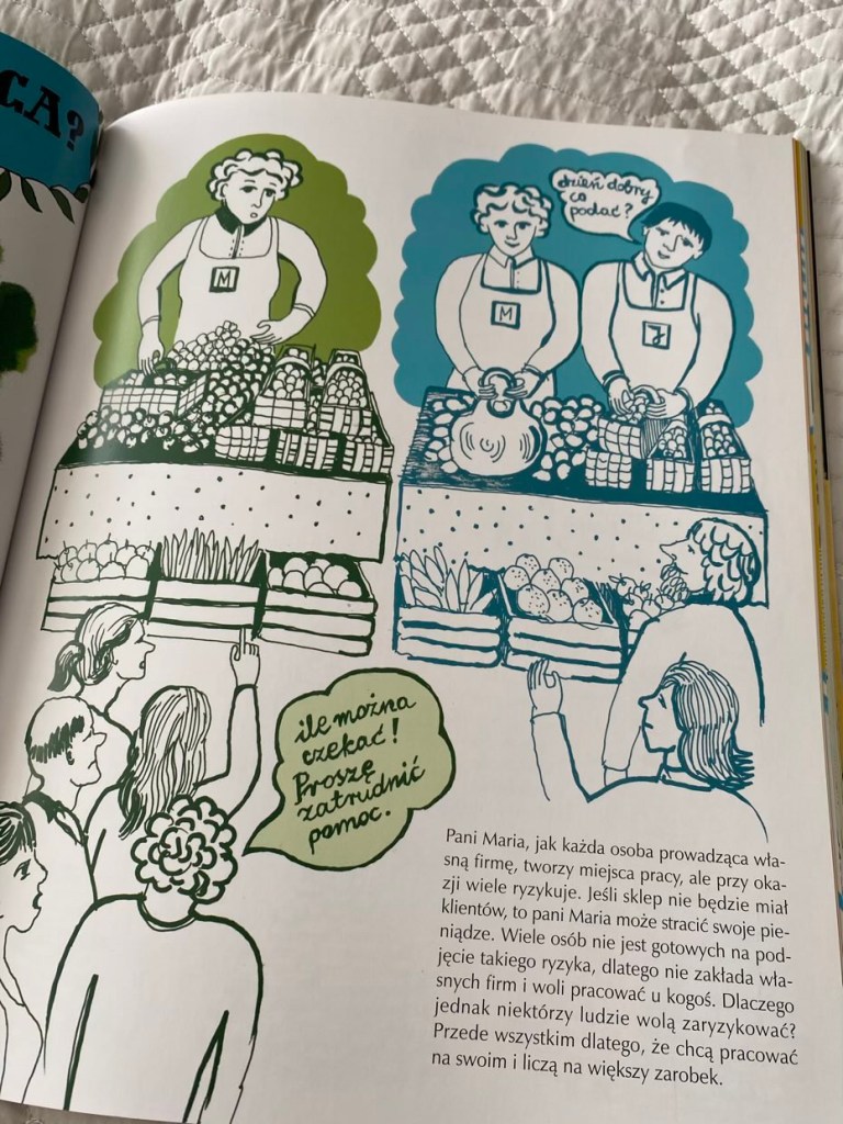 Na dobrze zilustrowanym przykładzie warzywniaka pani Marii, młodzi odbiorcy zrozumieją czy warto prowadzić firmę w pojedynkę, zatrudnić pomoc czy nawet założyć spółkę.