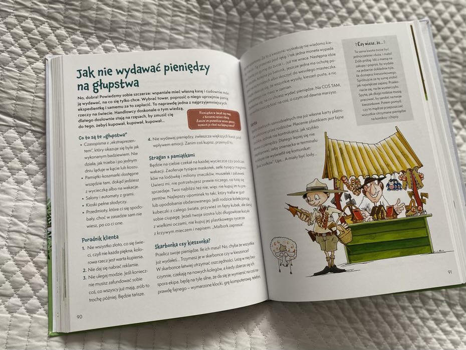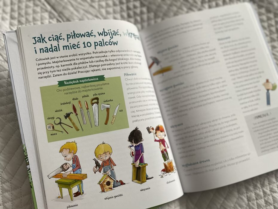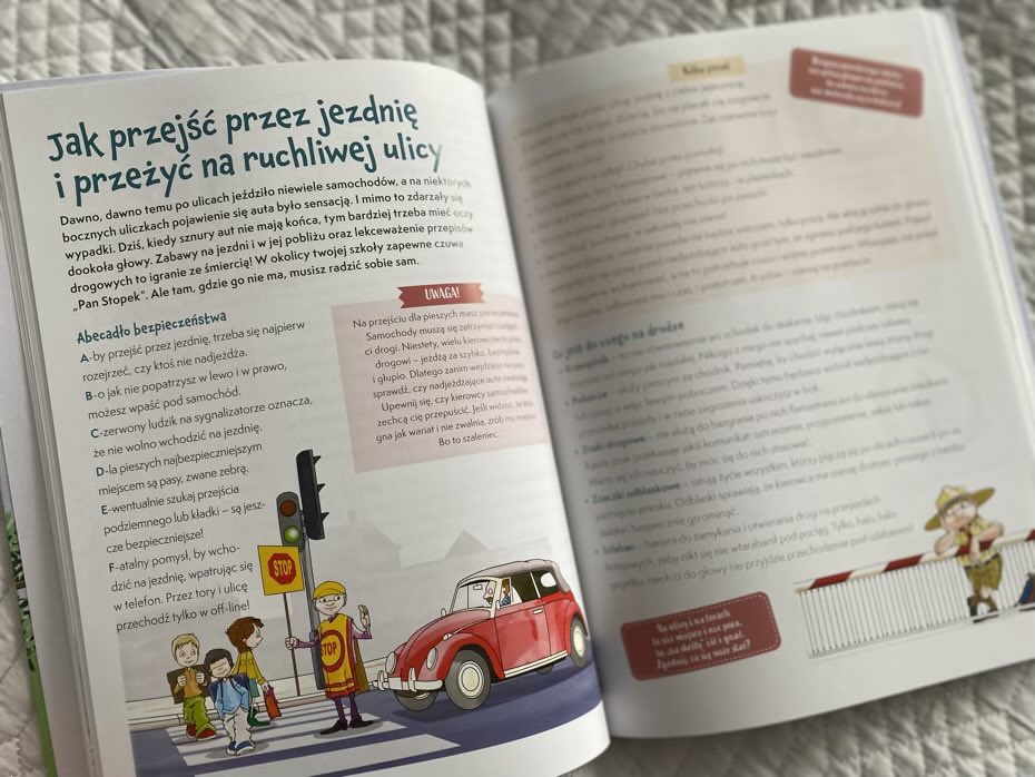 Młody czytelnik znajdzie wiele informacji, ciekawostek i wskazówek o tym, jak radzić sobie w konkretnych sytuacjach, np. Jak dobrze się bawić, ale nie kosztem innych. Jak nie dać się skusić na podejrzane cukierki. Jak się nie zgubić w tłumie. Jak nie wydawać pieniędzy na głupstwa. Jak wysłać wiadomość i wezwać pomoc. Jak spakować plecak. Jak rozbić namiot i zrobić szałas. Co zrobić, by dorośli cię słuchali. Jak ciąć, polować, wbijać, wkręcać i nadal mieć 10 palców. Jak nie mieć pecha i wiele innych tematów.