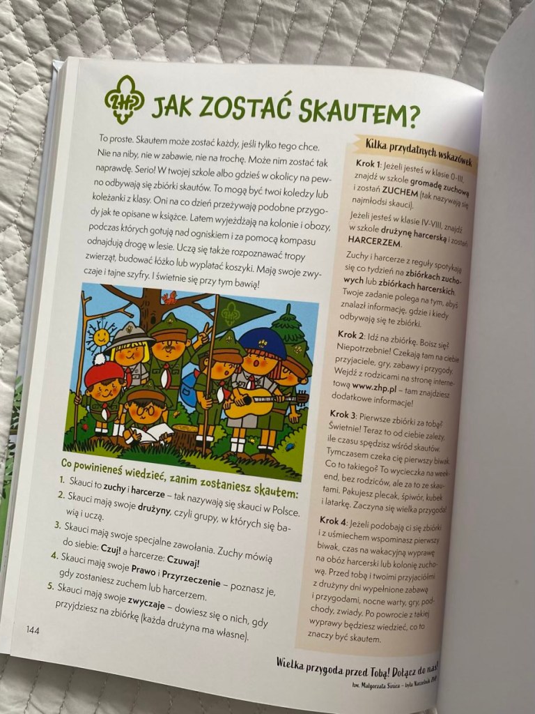 Na samym końcu jest strona, w której dziecko znajdzie kilka wskazówek jak zostać skautem. Adaś należy do Związku Harcerstwa Polskiego działającego poza granicami Polski. Jest to organizacja wychowawcza dla dzieci oraz młodzieży. Dodatkowo jest w angielskiej grupie Beavers (odpowiednik polskich „Zuchów”), w której uczy się wielu ciekawych i praktycznych rzeczy. W obu organizacjach opiekunowie stwarzają sympatyczną atmosferę, w której Adaś zdobywa nowe doświadczenia i uczy się gry zespołowej. Adaś uczył się niektórych z opisanych przez autora rzeczy, np.: wiązania węzłów, alfabetu Morse’a, rozkładania namiotu, rozpalania ogniskowa i przygotowywania jedzenia.