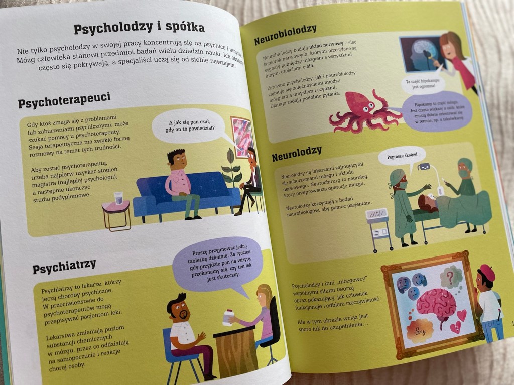 „Psychologia dla początkujących” to lektura dla dzieci wypełniona ciekawostkami dotyczącymi ludzkiego umysłu, ciała, uczuć i emocji. Jest po brzegi wypełniona pytaniami i rzetelnymi odpowiedziami. Każde zagadnienie wyjaśnione jest w łatwy i przystępny sposób tak, by młody czytelnik wszystko zrozumiał. Tytuł polecam dzieciom powyżej 7. roku życia.