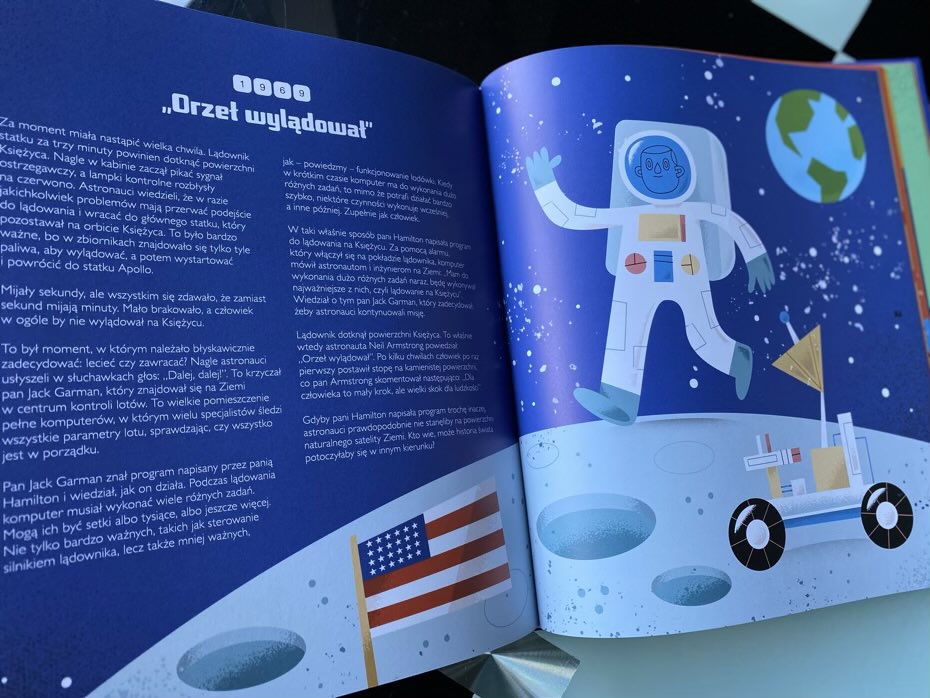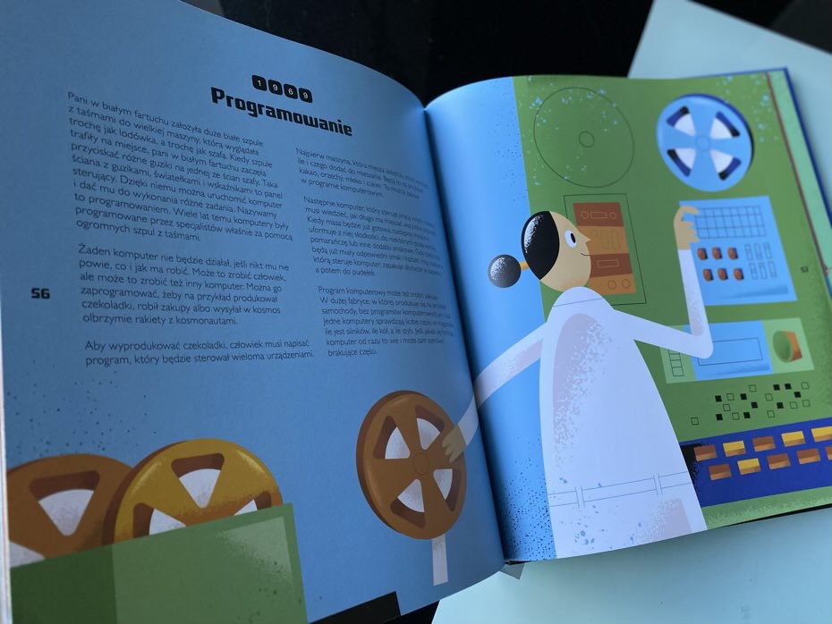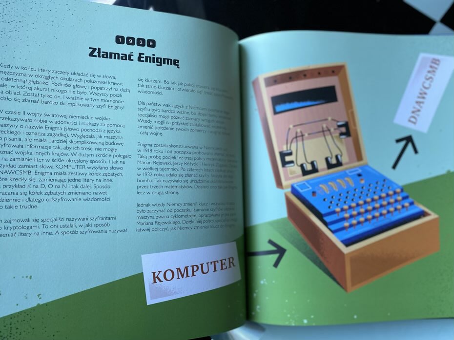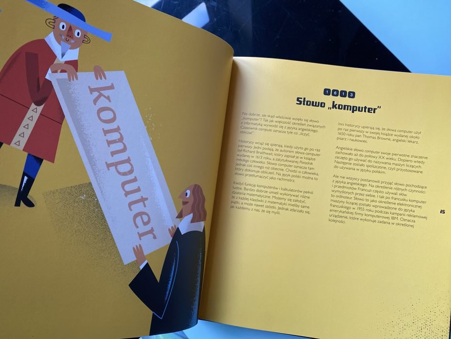 Z publikacji młodzi czytelnicy dowiedzą się choćby tego, że pierwszym komputerem elektronicznym był powstały na Uniwersytecie w Pensylwanii w latach 1943-45 ENIAC. Mieścił się aż w 42 szafach, a jego elementy ważyły łącznie 42 tony. Przeczytają o pojedynku szachowym z Garrym Kasparowem, który zapewniał, że nigdy nie przegra z komputerem. Niestety mistrz poniósł porażkę z superkomputerem Deep Blue. Dzieci poznają Mariana Rejewskiego, Jerzego Różyckiego i Henryka Zygalskiego, który podjęli próbę złamania kodu Enigmy. Ich ciężka praca nie poszła na marne, gdyż w 1932 roku udało się złamać szyfr. Wyśledzą także poczynienia Pani Hamilton, która napisała różne programy dla komputerów rakiety Apollo II. Gdyby nie kilka zmian, jakie narzuciła, astronauci nigdy nie stanęliby na powierzchni naturalnego satelity Ziemi i być może historia świata potoczyłaby się w innym kierunku.
