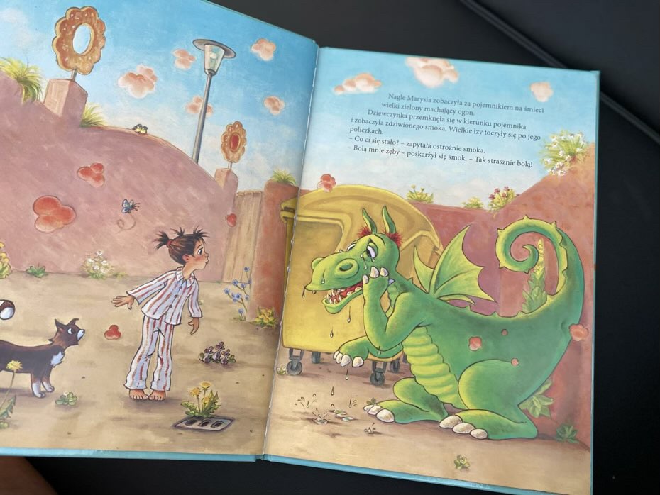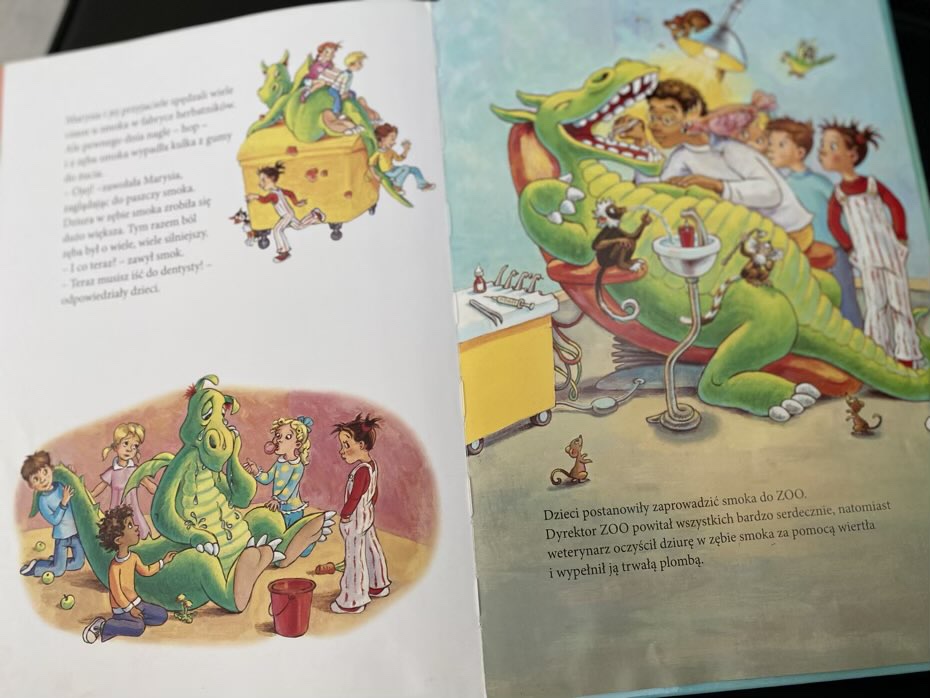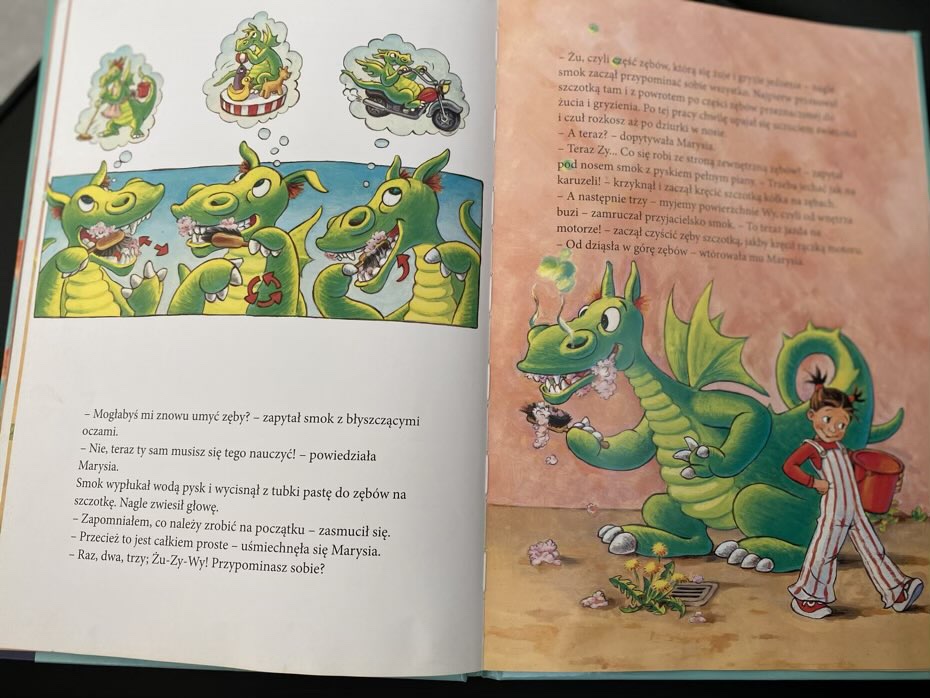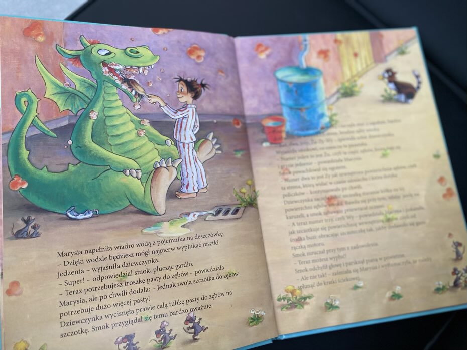 „Nawet smok musi myć zęby” to ładnie zaprezentowana lektura dla młodych czytelników. Na prawie wszystkich zdjęciach jest wiele szczegółów, które dzieci mogą odkryć. Myślę, że ta książka jest świetna, ponieważ uczy, jak ważne jest codzienne mycie zębów.