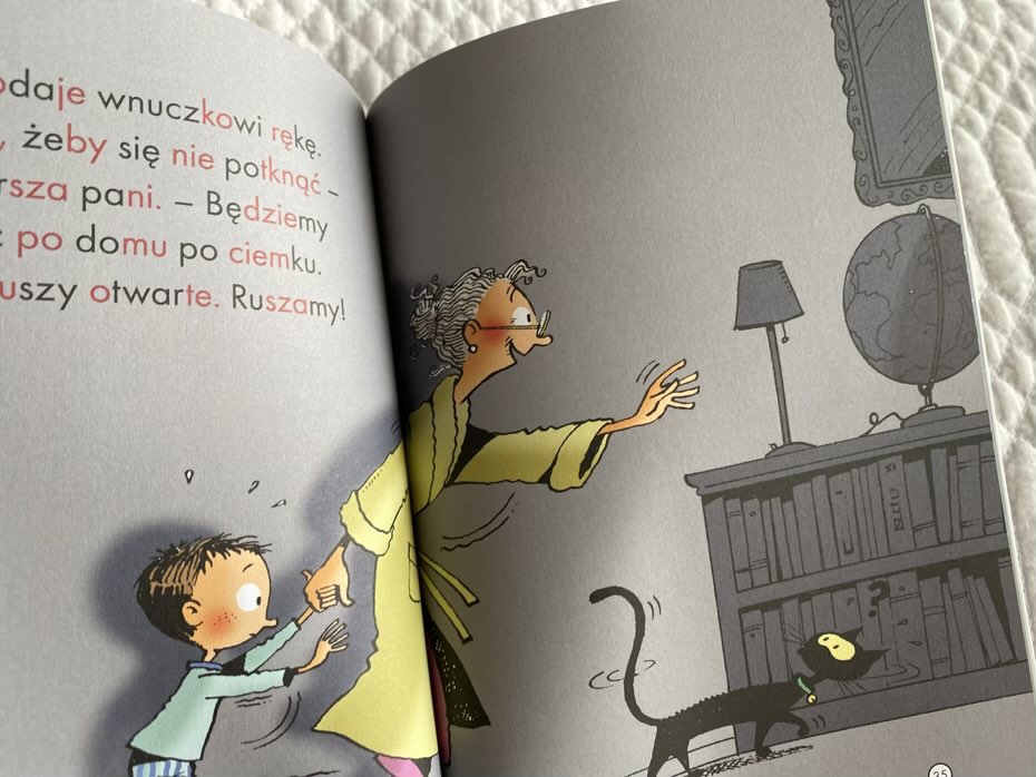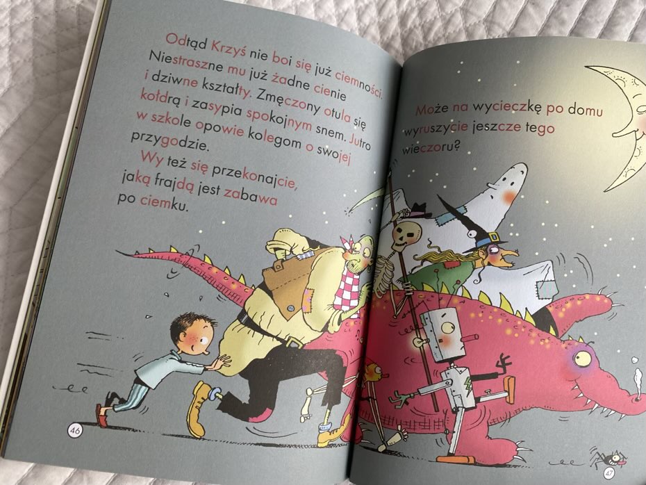 „Strach ma wielkie oczy” to krótka historia pokazująca młodym czytelnikom, jak można przezwyciężyć nocne lęki. Książeczka nadaje się do samodzielnego czytania, ponieważ cały tekst został podzielony na sylaby i wyróżniony kolorami: czarnym i czerwonym. Tytuł wydany jest w miękkiej oprawie, w małym formacie i na dobrej jakości papierze. Rysunki dobrze współgrają z opowiadaniem. Polecam.
