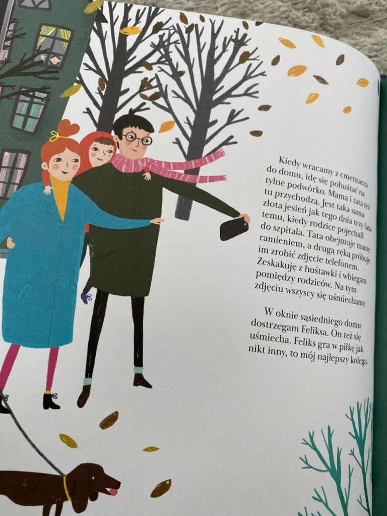 Na stronach pokazana jest codzienność, która toczy się dalej, pomimo smutku, a stopniowo z upływem czasu pojawia się więcej kolorów i radosnych tonów.