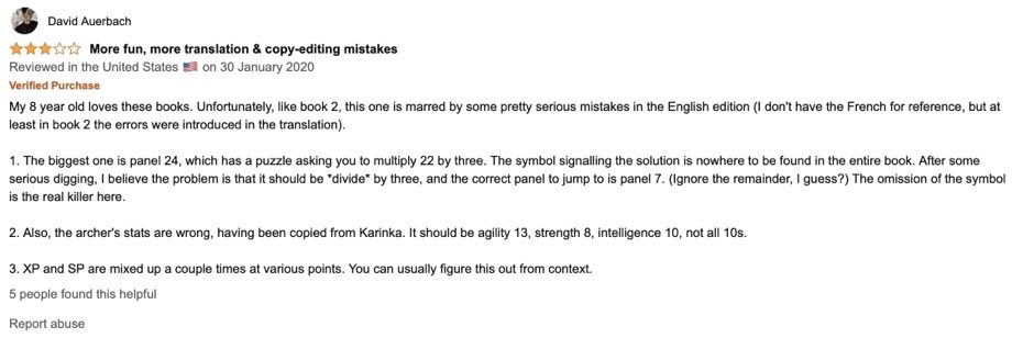 Zaznaczę, że był tam fragment, w którym prawie poddaliśmy się z książką całkowicie i z tego, co czytałem na forach internetowych, wiele ludzi w taki właśnie sposób skończyło zabawę z tą pozycją. Niektórzy dochodzą do zagadki, której nie potrafią rozwiązać i poddają się, zupełnie rezygnując. Moja żona też poddała się z trzecią częścią. Skakanie ze strony na stronę, poszukiwania i tym podobne znużyło ją i nie chciała dalej czytać. Jednak nam książka spodobała się na tyle, że nie potrafiliśmy się szybko poddać i dlatego szukałem pomocy na polskich forach lub stronach z recenzjami. Znalazłem tam niestety niewiele. W końcu wpadłem na pomysł przeszukania stron angielskojęzycznych i całe szczęście trafiłem na opinie książki na stronie Amazon (https://www.amazon.co.uk/product-reviews/1683691474/ref=cm_cr_getr_d_paging_btm_prev_1?ie=UTF8&reviewerType=all_reviews&pageNumber=1)