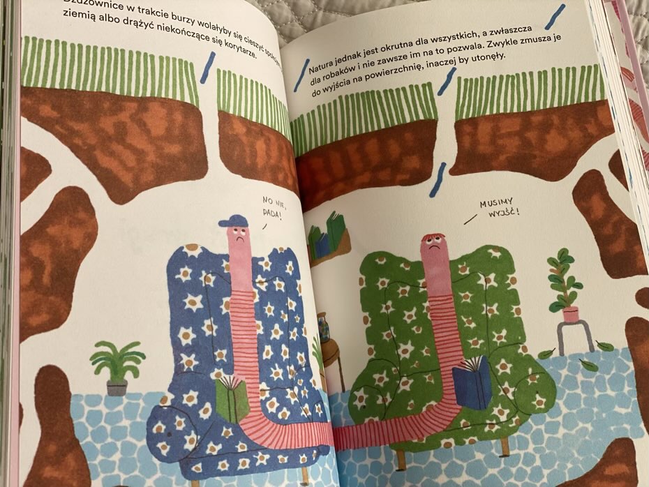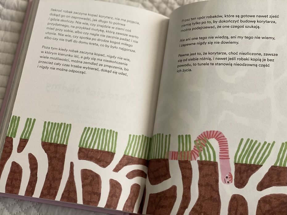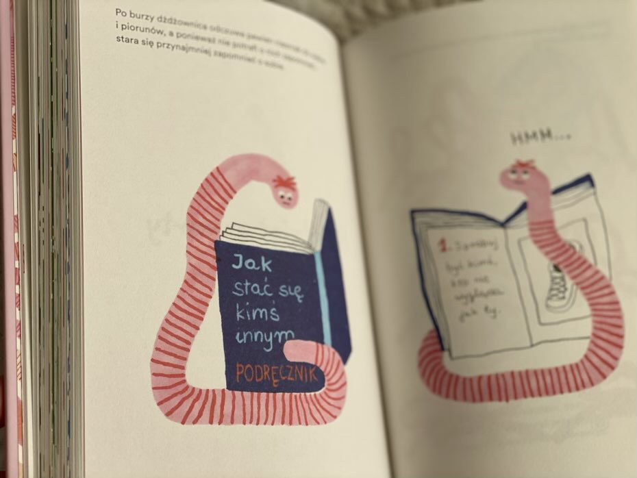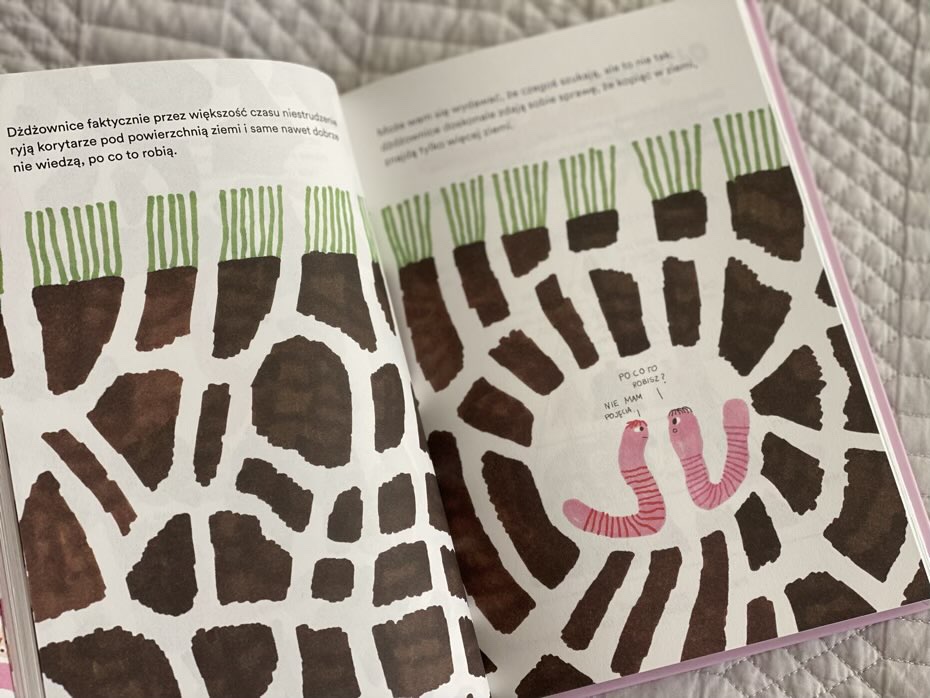 “Pokręcone życie dżdżownicy” to książka łącząca obserwacje naukowe i olśniewającą ironię na ponad 200. ilustrowanych stronach, opowiada o bardzo małym zwierzęciu, które stoi w obliczu wielkich zmian i wielkich pytań. Każda strona przedstawia prosty rysunek z tytułowym bohaterem. Tekst jest łatwy w odbiorze i myślę, że książka nadaje się dla dzieci powyżej 6. roku życia.
