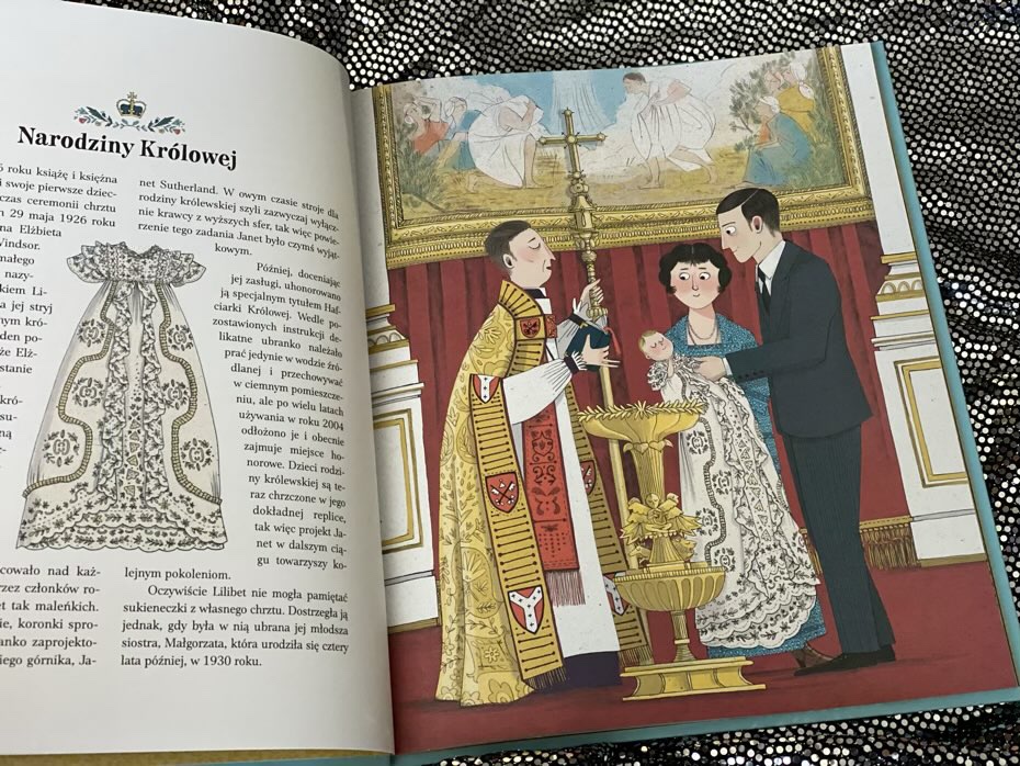 „Garderoba królowej. Historia Elżbiety II i jej strojów” to tytuł opowiadający dzieciom historię młodej księżniczki, która wyrosła na jedną z najbardziej lubianych i najdłużej służących osób rodziny królewskiej. Pozycja porusza tematy wojennych napraw ciężarówek, szycia sukni ślubnych z książeczki żywnościowej, wspaniałych ubiorów, klejnotów koronnych i słynnych królewskich kaloszy.