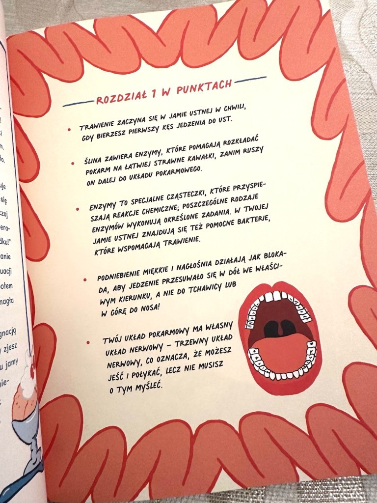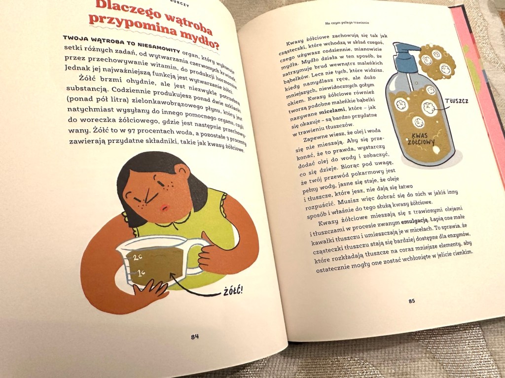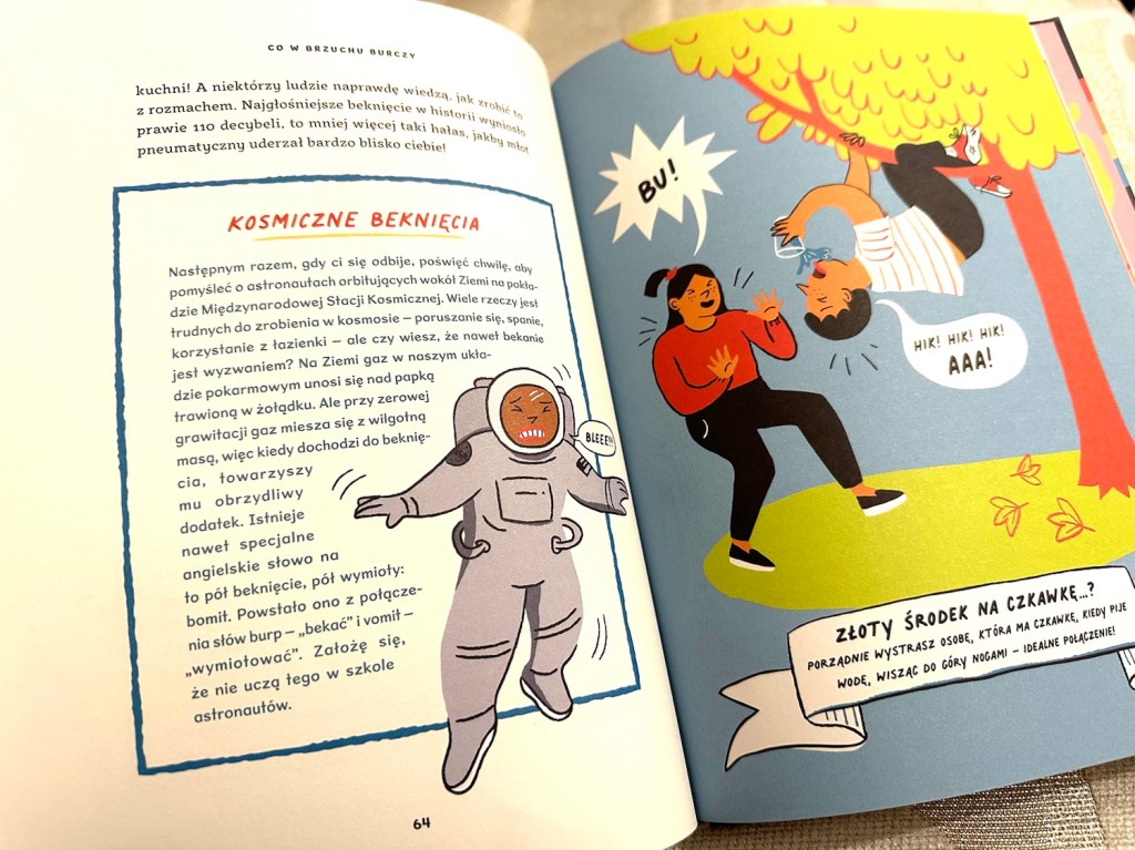 „Co w brzuchu burczy. Czyli o tym, jak twoje ciało zmienia jedzenie w paliwo (i kupę)” to przewodnik po jelitach człowieka, który pokazuje dzieciom jak działa ludzkie ciało i zaspokaja ciekawość czytelników, dostarczając im solidnej dawki wiedzy podanej w “lekkostrawny” sposób.