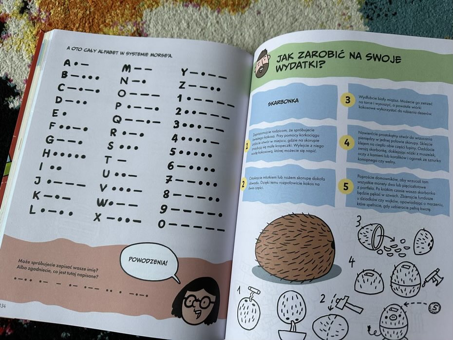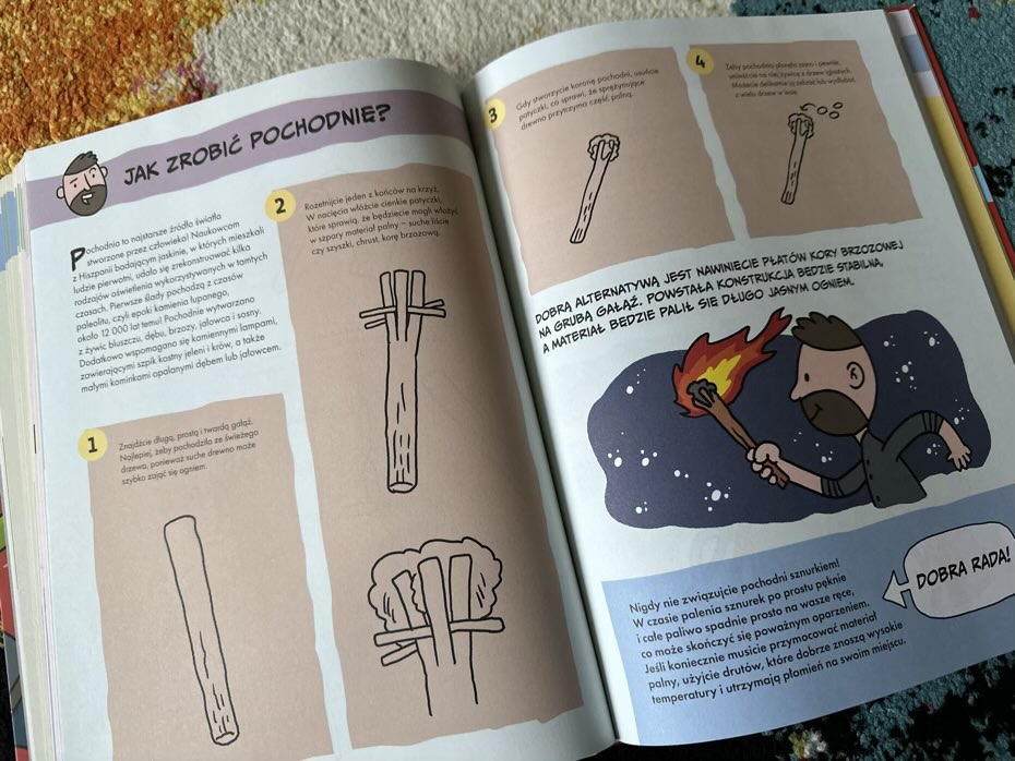 Publikacja podzielona jest na pięć głównych działów. W pierwszym dziecko będzie mogło wykazać się umiejętnościami kreatywnymi, wykona domowy wulkan, bezpieczną bombę, czy zaprojektuje własną gazetkę. W dziale „Pożyteczne” dostanie solidną porcję porad jak zacerować skarpetkę, nakryć do stołu lub przyszyć guzik. W trzeciej części pozna ciekawe zabawy i przydatne zajęcia na świeżym powietrzu, np.: jak rozpalić ognisko bez zapałek, jak zrobić pochodnię lub zmienić oponę w rowerze. W Kolejnym rozdziale dziecko pozna porady, które mogą być bardzo pożyteczne i pomocne w razie jakiegoś niebezpieczeństwa. Młody czytelnik znajdzie tutaj bardzo ważne i cenne informacje, np. jak poradzić sobie z uporczywą czkawką, krwotokiem z nosa, albo ze złamaną nogą. Ostatnia sekcja dotyczy sprytnych i ciekawych umiejętności, np.: jak porozumiewać się w języku migowym, jak napisać list lub jak zarobić na swoje wydatki.