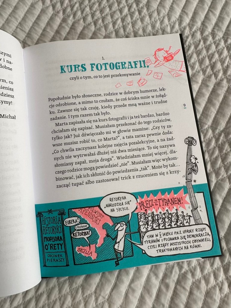 „Co ty mówisz?! Magia słów, czyli retoryka dla dzieci” to mądra, pożyteczna i ważna pozycja do przeczytania dla dzieci, jak i rodziców. Ciekawe ćwiczenia pomogą utrwalić zdobytą wiedzę i wykorzystać ją do negocjacji w szkole, pracy i na co dzień. Według mnie to ogromnie wartościowe jest przedyskutowanie omawianego tematu i własnych spostrzeżeń. Tytuł gorąco polecam dzieciom po 6. roku życia.