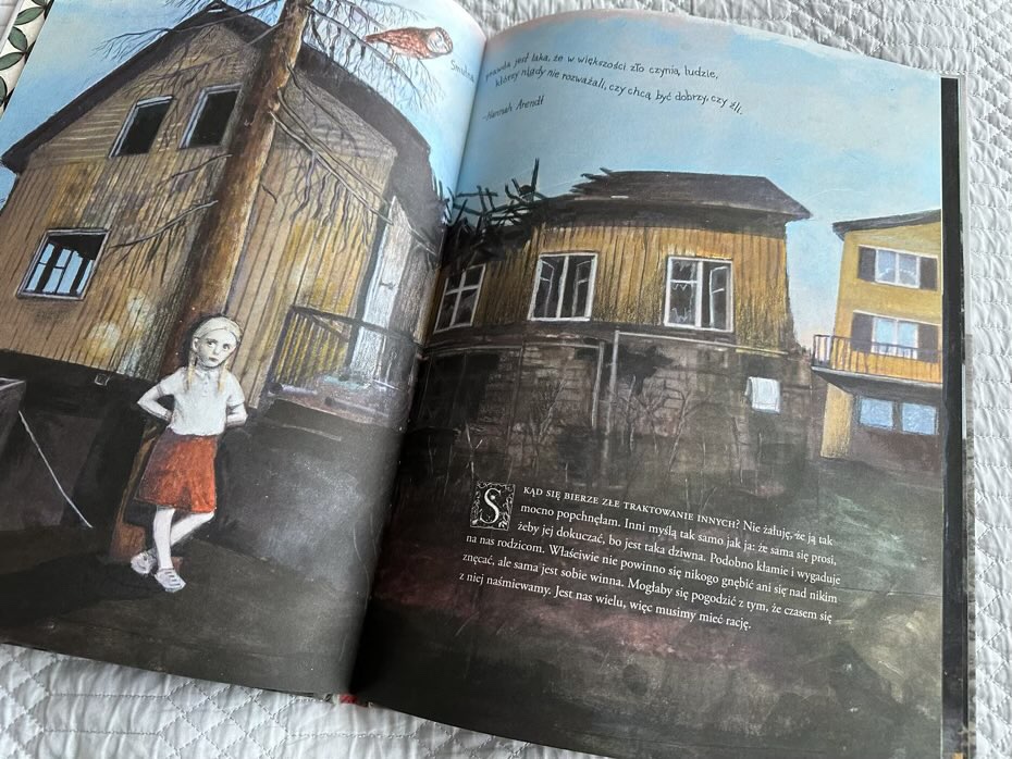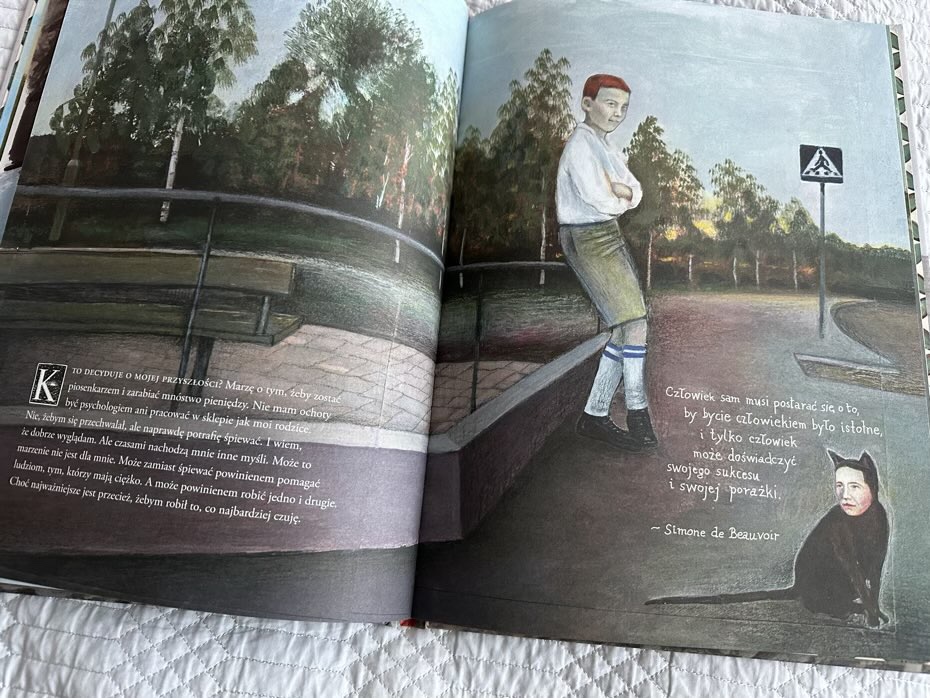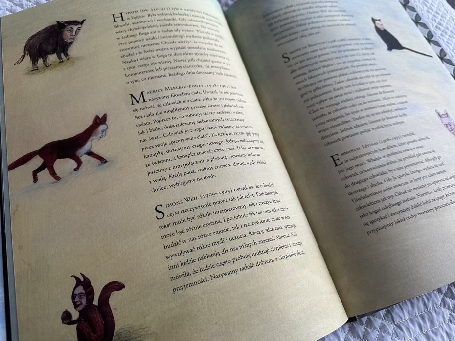 Każda rozkładówka poświęcona jest jednemu z dziesięciorga dzieci, które opowiadają o sytuacjach z własnego życia. Czcionka jest wyraźna, a tekst zrozumiały. Na stronie znajduje się także krótki wycinek myśli nieżyjącego już filozofa i jego zwierzęca kreatura. Ilustracje miejscami są ponure i poważne, jednak uważam, że ściśle współgrają z tekstem.