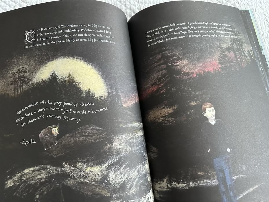 Może nie każdemu grafika przypadnie do gustu, jednak znajdą się osoby, które dostrzegą jej piękno. To właśnie przez jej na pozór ponure obrazki książka z góry, bez przeczytania, została negatywnie oceniona przez mojego męża. Jednak po przeczytaniu fragmentu „Czy Bóg istnieje?”, Paweł inaczej podszedł do oceny lektury.