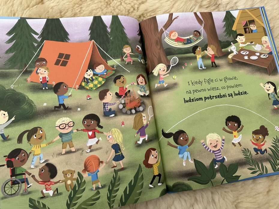 Każda rozkładówka to kolorowe ilustracje z mnóstwem szczegółów do podziwiania. Ogromną zaletą jest duża gama postaci oraz różne kultury, z których pochodzą bohaterowie. To powoduje, że młodzi czytelnicy widzą, że wszyscy jesteśmy różni, ale też i podobni.
