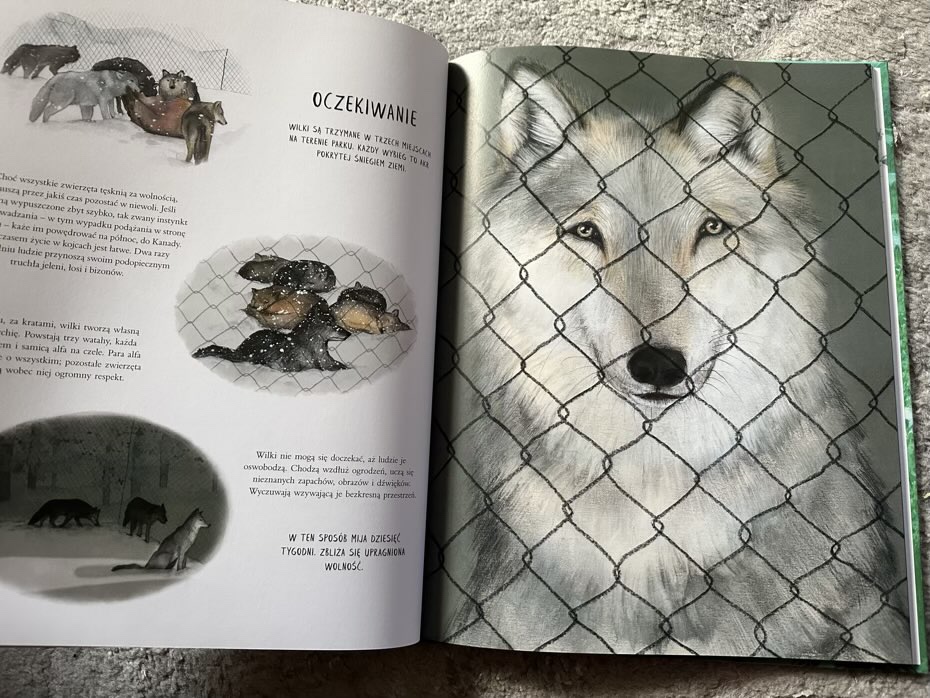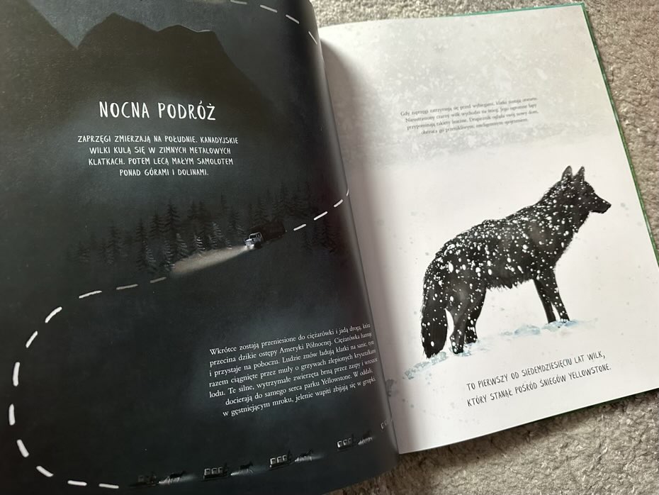 Ta estetycznie wydana książka jest dużego formatu i podzielona została na 3 główne działy. W pierwszym dowiemy się, w jaki sposób wilki trafiły do Parku Yellowstone, ich adaptację do zaśnieżonych terenów, kontakt z innymi zwierzętami i pierwsze watahy. Druga część poświęcona jest faunie i florze oraz powrotowi wilków na teren parku. Natomiast ostatni rozdział wyjaśni dzieciom dlaczego drapieżniki są ważne, czym jest rewilding i jak działa natura.