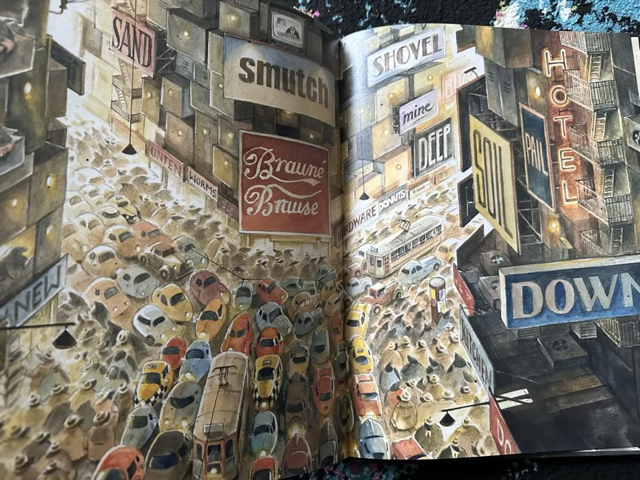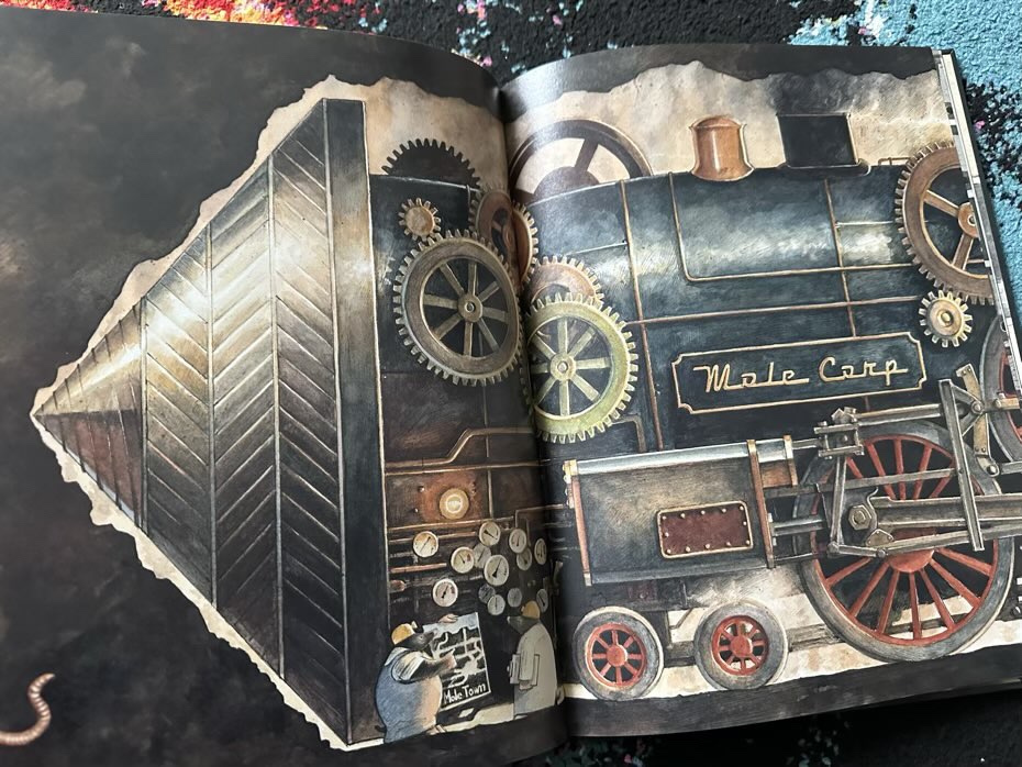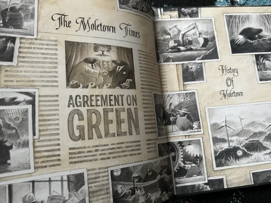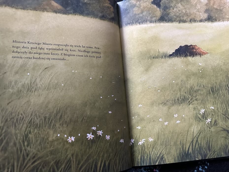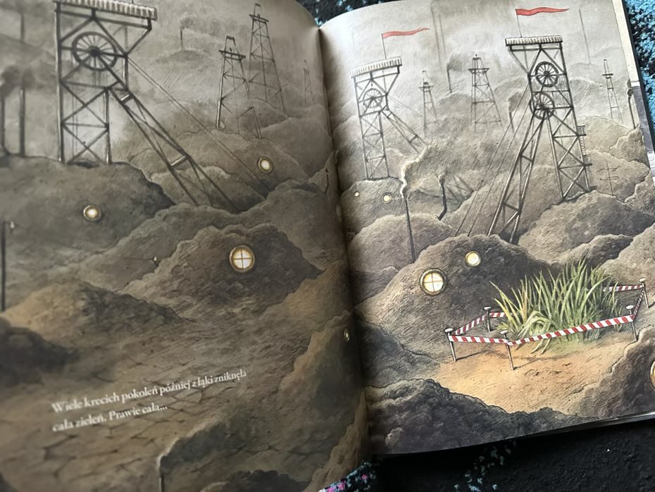 Ilustracje są szczegółowe i zawiłe, warto poświęcić kilka minut na każdą rozkładówkę, badając wszystkie małe zakamarki i kryjówki, które autor stworzył dla kretów. Według mnie to doskonała książka do rozmowy o problemach związanych z przeludnieniem, nadwyrężaniem zasobów naturalnych i ich rozwiązaniami, takimi jak choćby ekologiczne źródła energii.