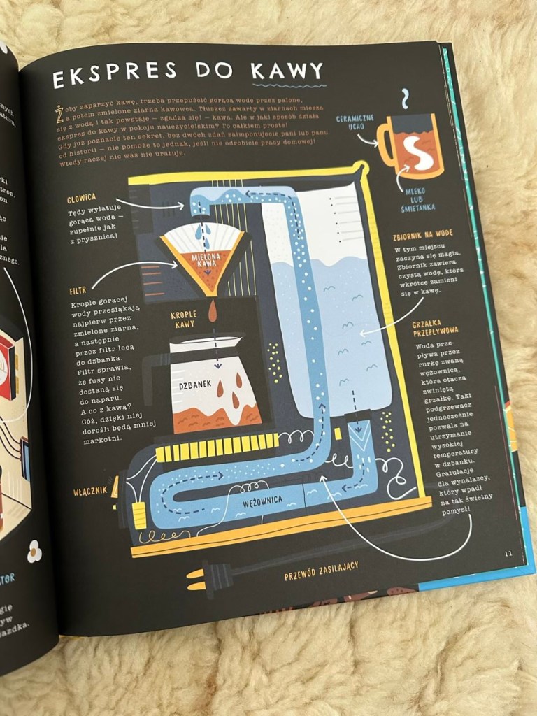 „Co jest w środku. Niezwykłe wnętrza zwykłych rzeczy” to przystępna, wciągająca i edukacyjna lektura, idealna dla tych młodych umysłów, które są głodne wiedzy. Tytuł wydany jest w tłoczonej i twardej oprawie na papierze dobrej jakości. Polecam dzieciom od lat 6. oraz ciekawskim majsterkowiczom.
