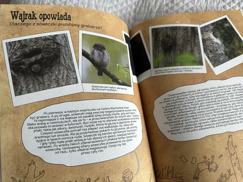 W ptasim westernie jest mnóstwo wiedzy podanej w sposób lekki i przystępny. Młodzi czytelnicy dowiedzą się wielu ciekawych informacji na temat mieszkańców Puszczy Białowieskiej i ich zwyczajów. Rysunki są proste, a postacie charakterystyczne. Pomiędzy poszczególnymi rozdziałami Adama Wajrak wplata ornitologię, czyli naukę o ptakach/lesie oraz ciekawe zdjęcia jego autorstwa.