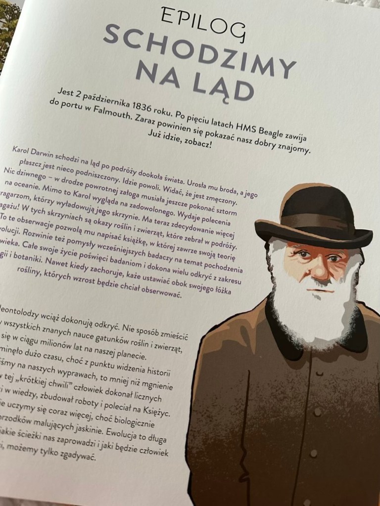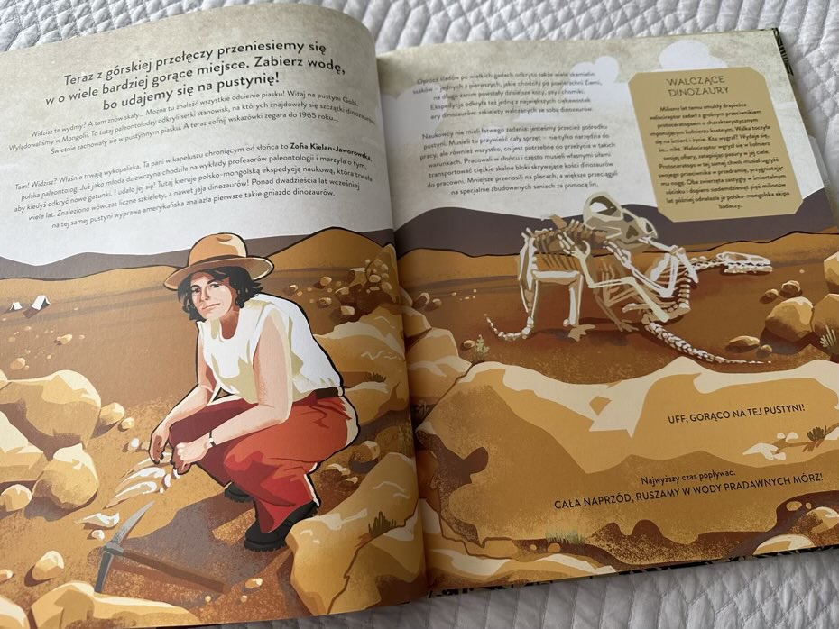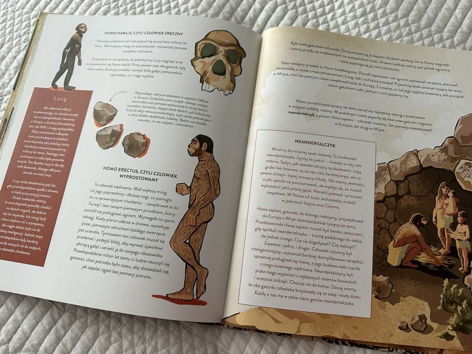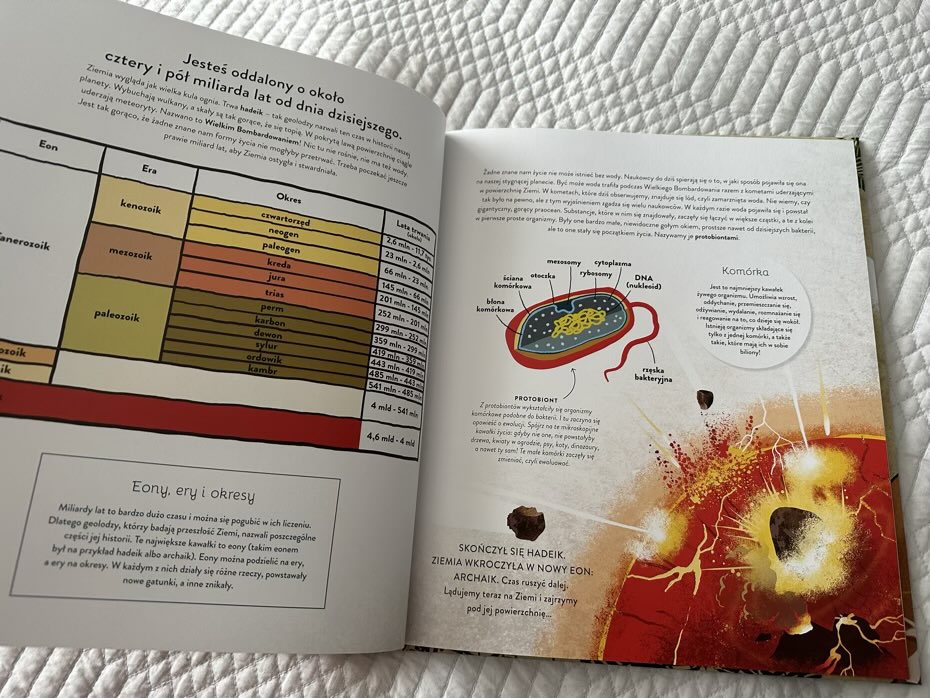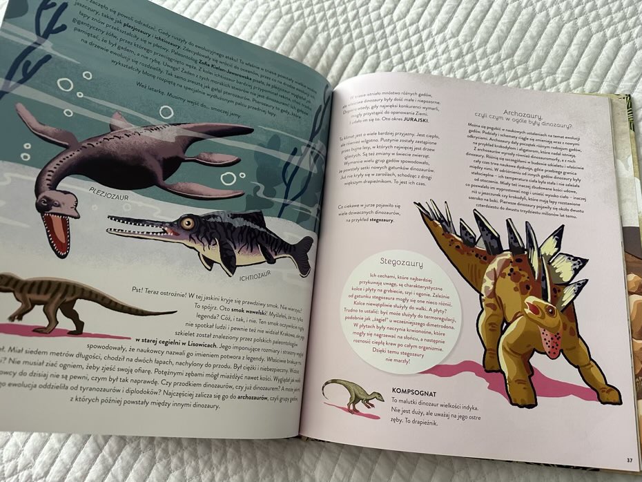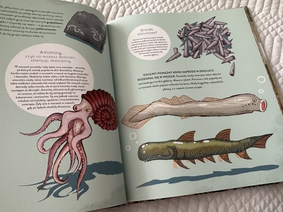 Myślę, że każdy mały pasjonat znajdzie tutaj coś dla siebie. Mamy tu rozkładówki o kosmosie, dinozaurach i innych zwierzętach. Jest także krótka wzmianka o Darwinie, od którego zaczęła się teoria ewolucji. W książkę wplecione zostały dodatkowe ciekawostki, przede wszystkim dotyczące znalezisk z terenu Polski: rycin i tabel.