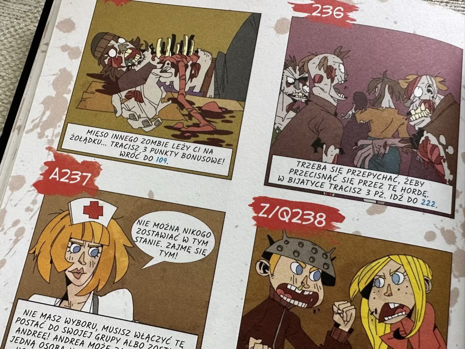 „Zombie” to tytuł komiksu, w którym bohaterem jest czytelnik. Na okładce rekomendowana grupa wiekowa to 10+, jednak osobiście uważam, że odbiorcą powinien być przynajmniej piętnastolatek. Rozumiem, że kadry w większości pokazują zombiaki, zalane krwią miejsca, ale czy młode dzieci muszą to oglądać od najmłodszych lat? Pokusiłam się na ten komiks dlatego, że jest rekomendowany dla młodszych i starszych graczy. Jednak po obejrzeniu kadrów, schowałam go na najwyższą półkę, z dala od małych rączek.