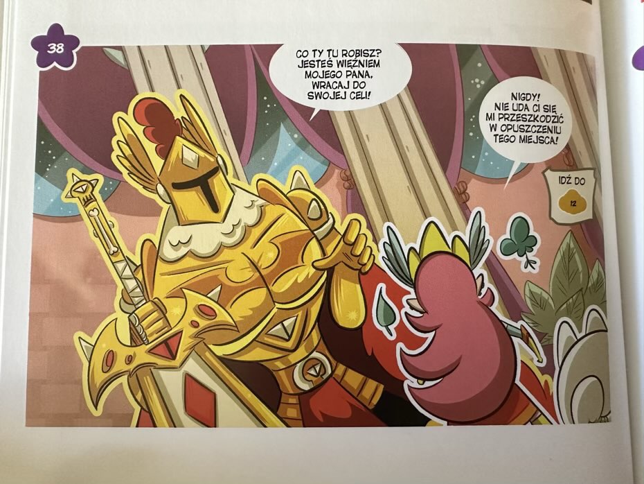Komiks ma pocięte zakładki w różnych kolorach z numerem i kształtem, które wskazują następne pole do czytania.