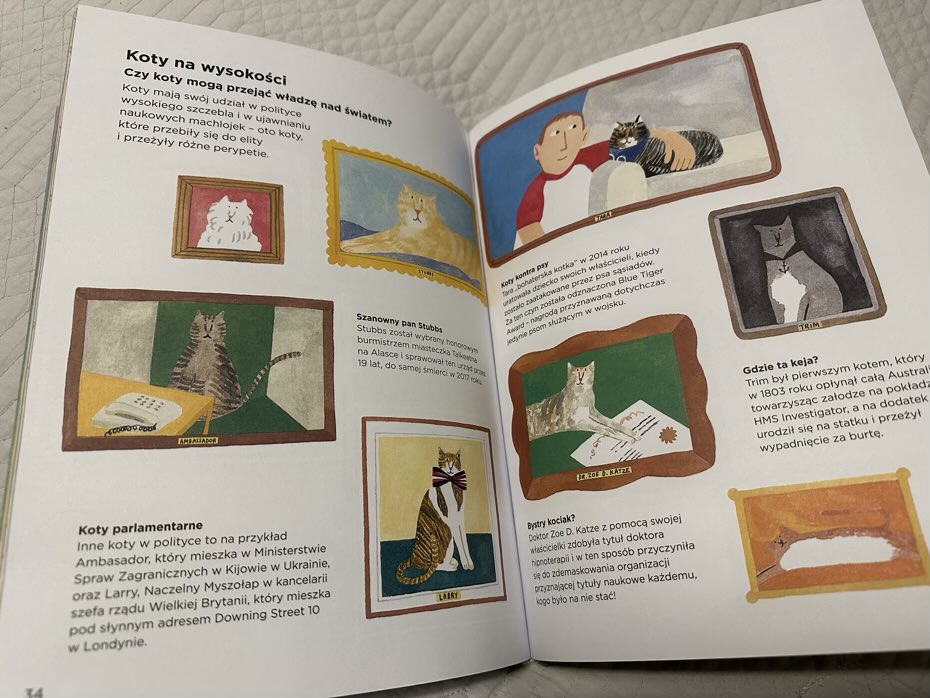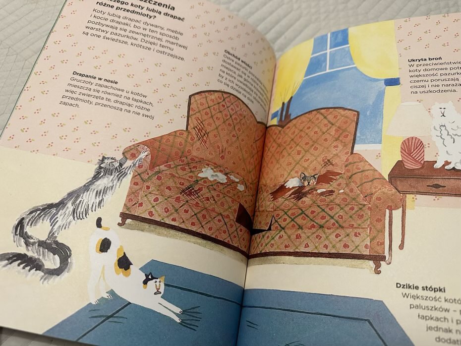 Każda podwójna rozkładówka dotyczy innego aspektu życia lub wiedzy o kotach. Pojawiające się ilustracje oferują delikatny humor, treść jest lekka, a informacje są solidne, dodatkowo wzmocnione końcowym słownikiem kociego słownictwa.