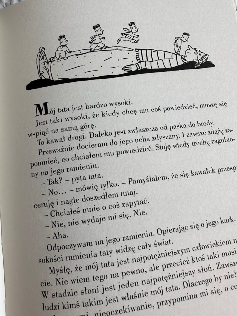 „Tata” to tytuł składający się z ponad 40 krótkich rozdziałów. Między treścią o super tacie wplatane są ilustracje, częściowo kolorowe, a częściowo czarne. Toon Tellegen w ciekawy sposób przedstawił tatę widzianego oczami syna. Książka wydana jest w twardej oprawie nakładem Wydawnictwa Dwie Siostry. Jedyne, na co zwróciłam uwagę, to brak ponumerowanych stron, co może utrudnić znalezienie przerwanej historii i powrót do lektury.