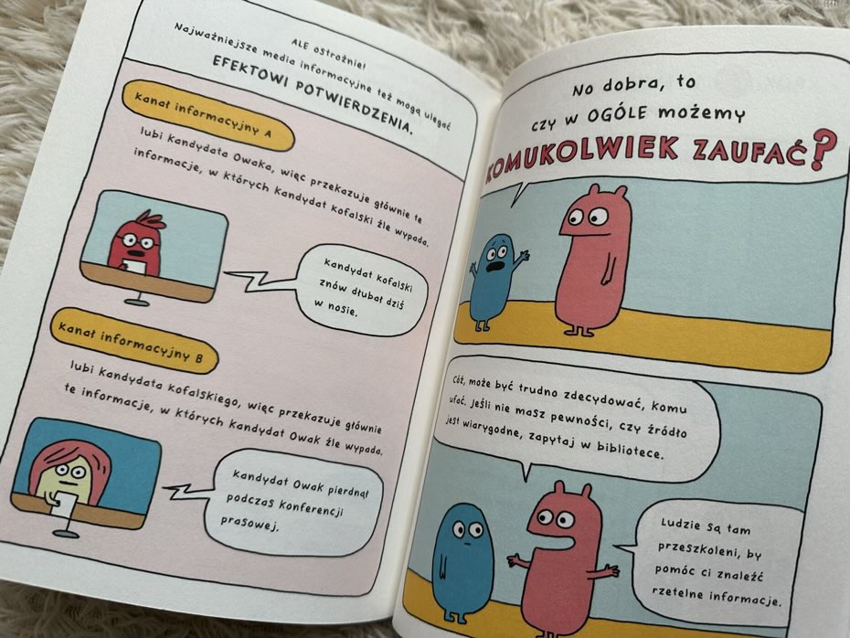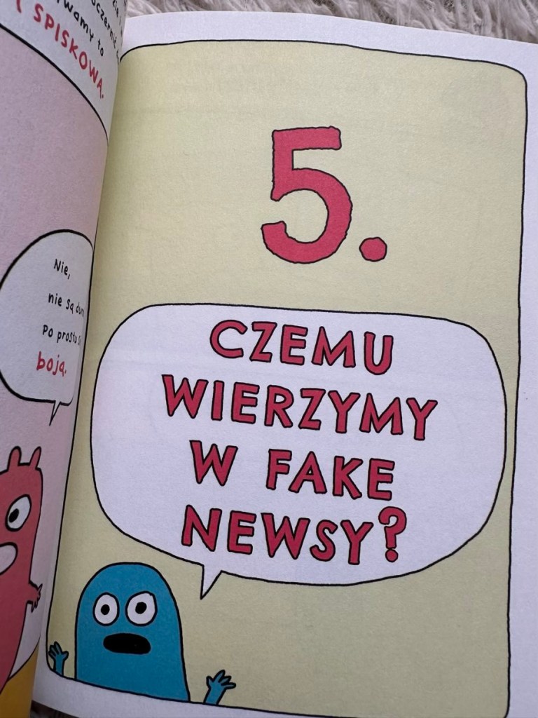 „Fake newsy. Inwazja morderczych majtek!” w formie powieści graficznej bardzo przypadła nam do gustu. Zawarte na stronach informacje mówią o tym, czym są wiadomości, jak wyglądają te fałszywe, dlaczego ludzie je tworzą, jak się rozprzestrzeniają i co możemy zrobić, aby nie dać się im nabrać. Według mnie to książka warta uwagi, która skłania do refleksji, dyskusji i szukania prawdy w całym. Polecam!