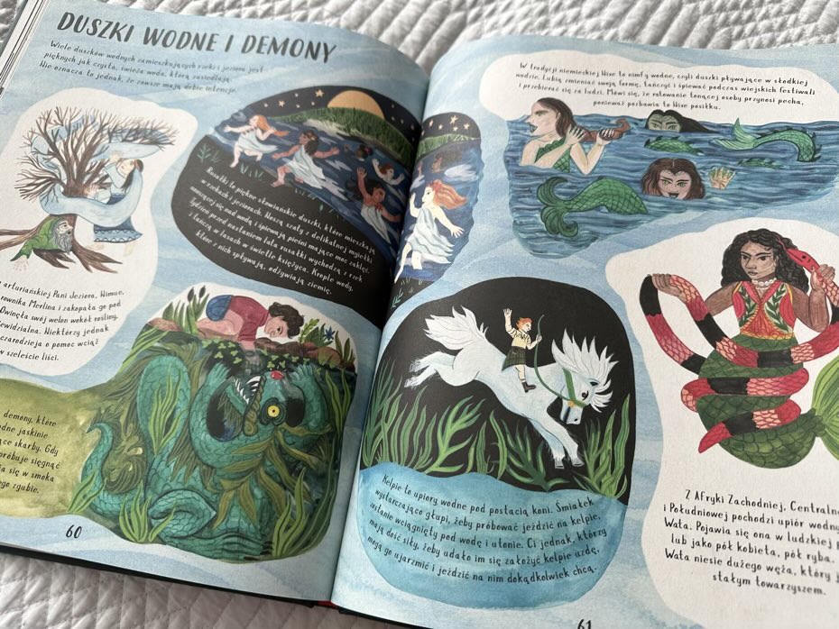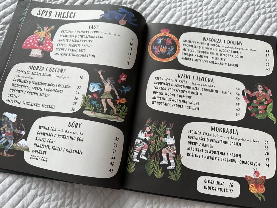 Bardzo podoba mi się, jak każdy fragment folkloru jest skondensowany w krótkim akapicie i opatrzony ilustracjami. Grafika jest kapryśna i przyciąga wzrok. Rysunki są żywe, odważne i wykonane są w jasnej kolorystyce.